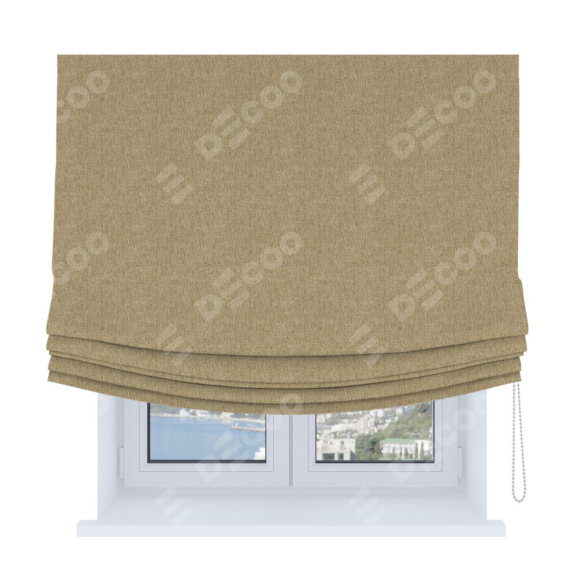 Римская штора Soft производителя «Cortin», используется для проёма, пошита из ткани стиф димаут бежевый, артикул ткани 18083. Имеет универсальный механизм и подходит для монтажа: на потолок, на стену и в нишу. В отличие от стандартных римских штор, римская штора Soft не имеет горизонтальных вставок и нижнего отвеса. Это позволяет ткани произвольно драпироваться в свободные мягкие складки.