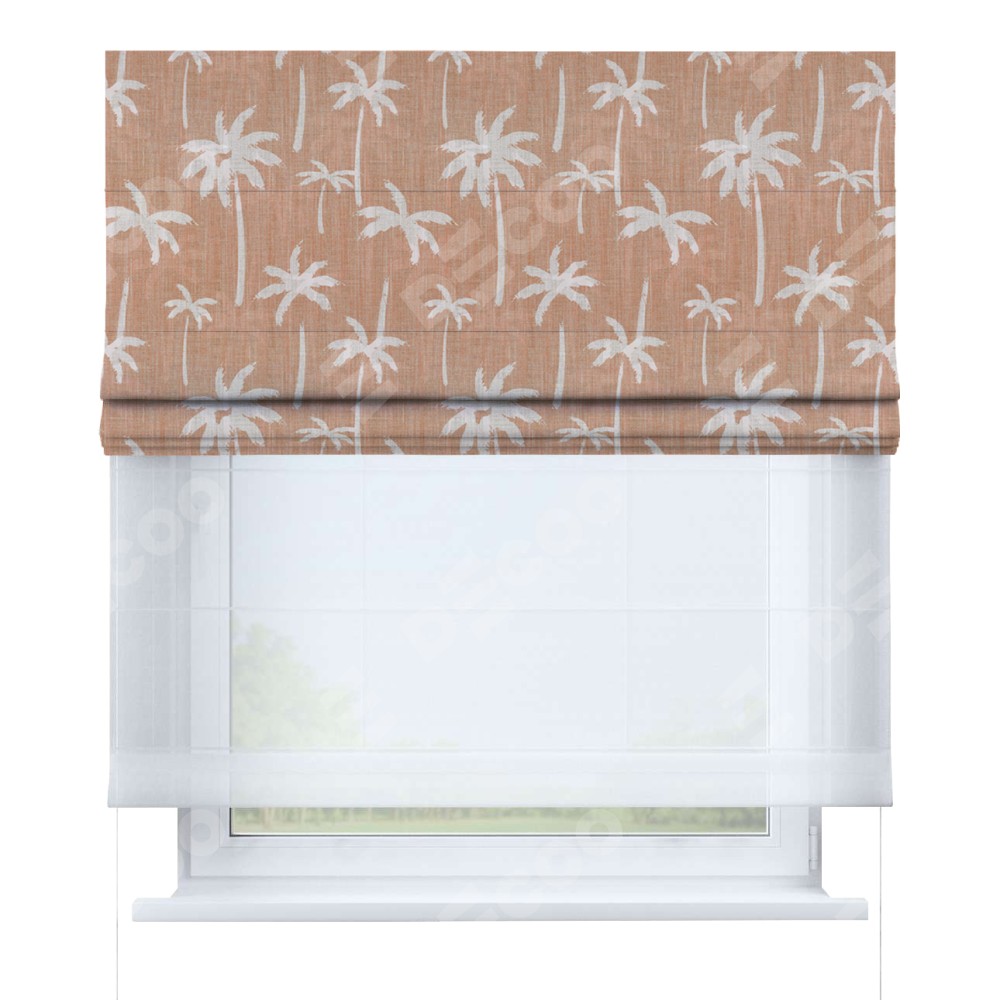 Римская штора день-ночь производителя «Cortin», используется для проёма, пошита из двух полотен, с лицевой блэкаут с нанесением сублимационной печати «Пальмы на закате», вторая ткань тюль (по стандарту комплектуется тюль белого цвета артикул V-01). Имеет универсальный механизм и подходит для монтажа: на потолок, на стену и в нишу.