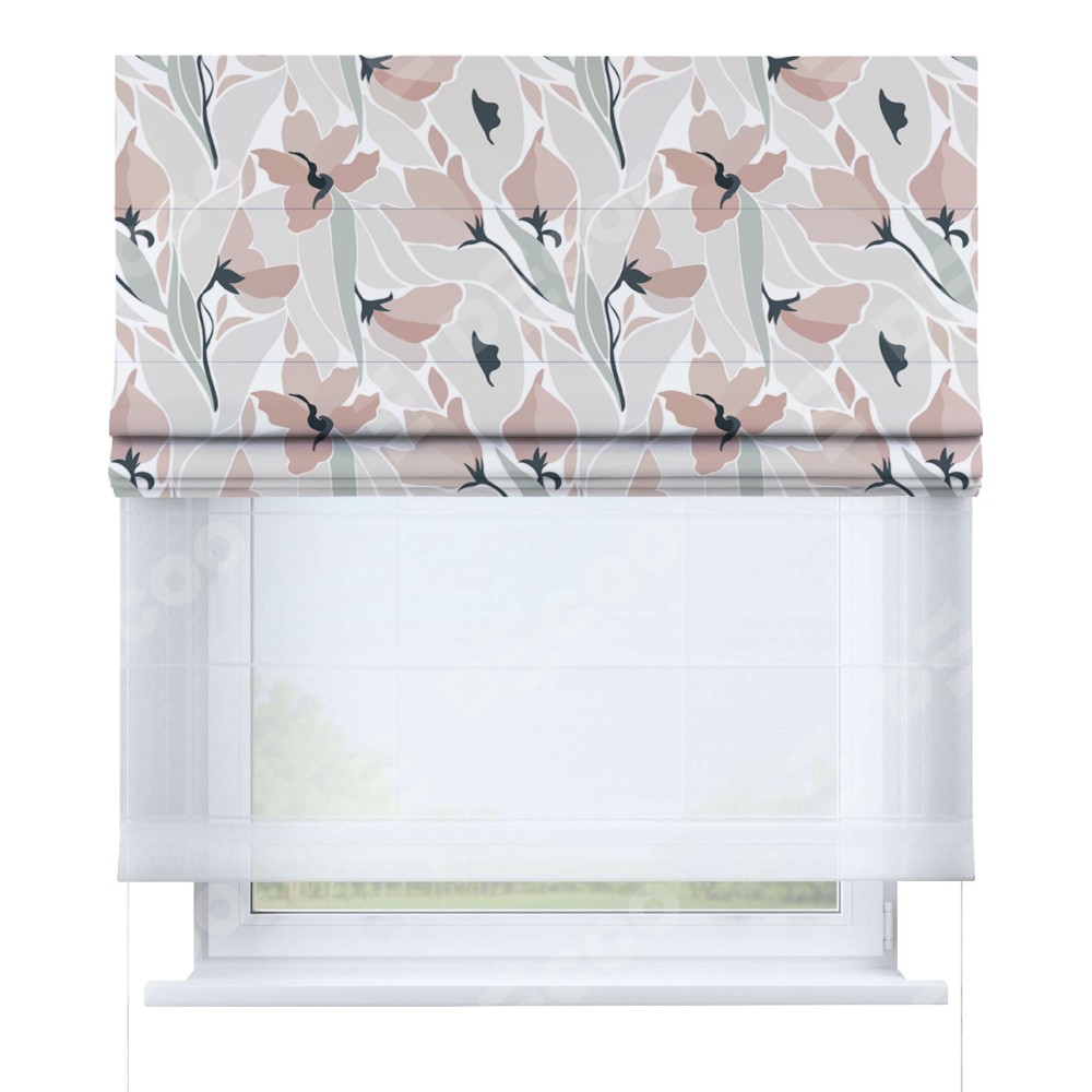 Римская штора день-ночь производителя «Cortin», используется для проёма, пошита из двух полотен, с лицевой блэкаут с нанесением сублимационной печати «Тюльпаны пастель», вторая ткань тюль (по стандарту комплектуется тюль белого цвета артикул V-01). Имеет универсальный механизм и подходит для монтажа: на потолок, на стену и в нишу.