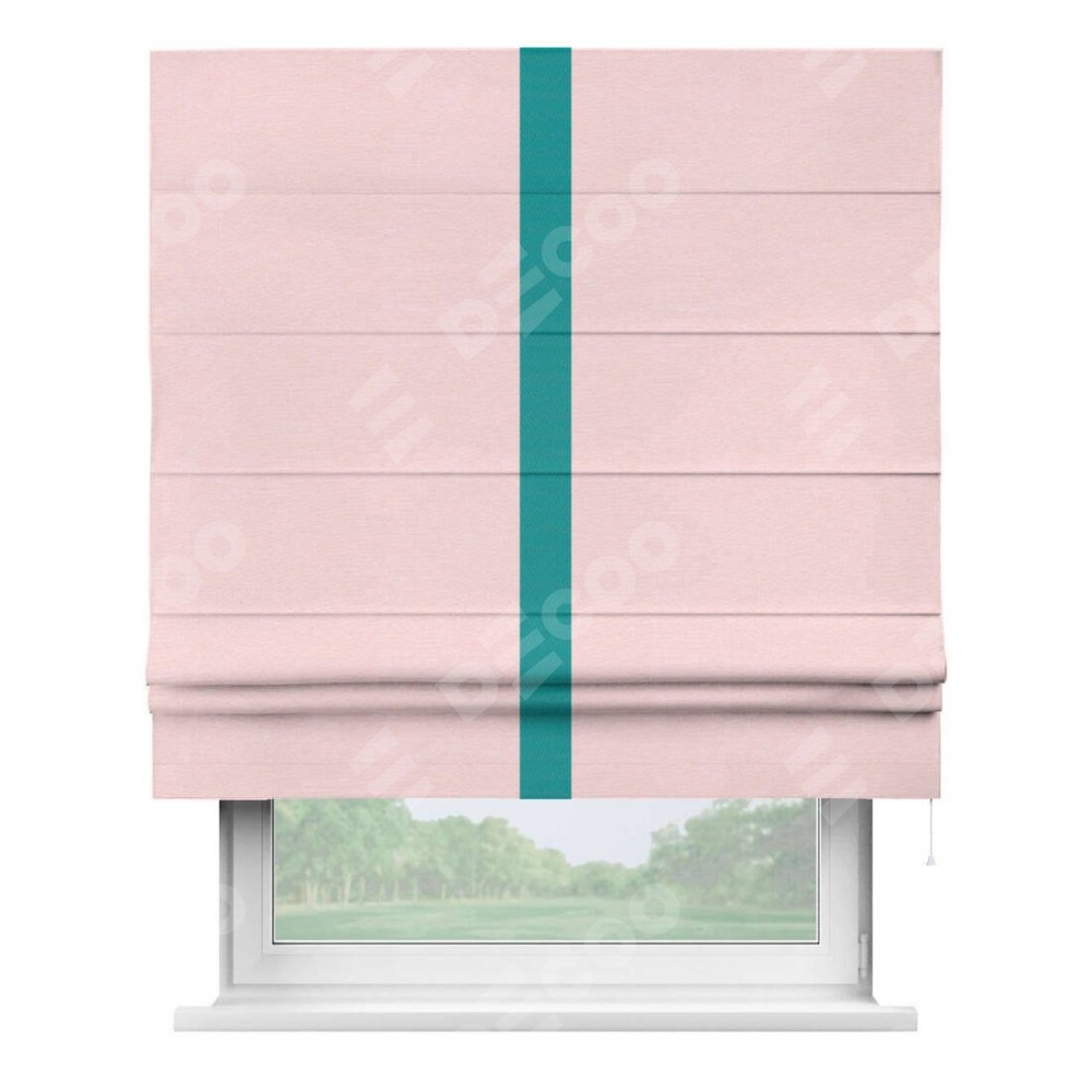 Римская штора производителя «Cortin», используется для проёма, пошита из ткани блэкаут однотонный розовый, артикул ткани 83046. Отделка шторы кантом «Хайвей», ткань для канта используется из блэкаута однотонного разной расцветки на выбор. Имеет универсальный механизм и подходит для монтажа: на потолок, на стену и в нишу.