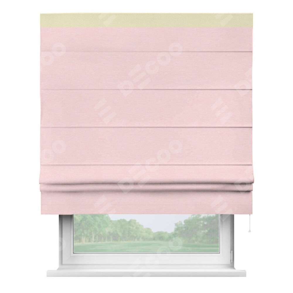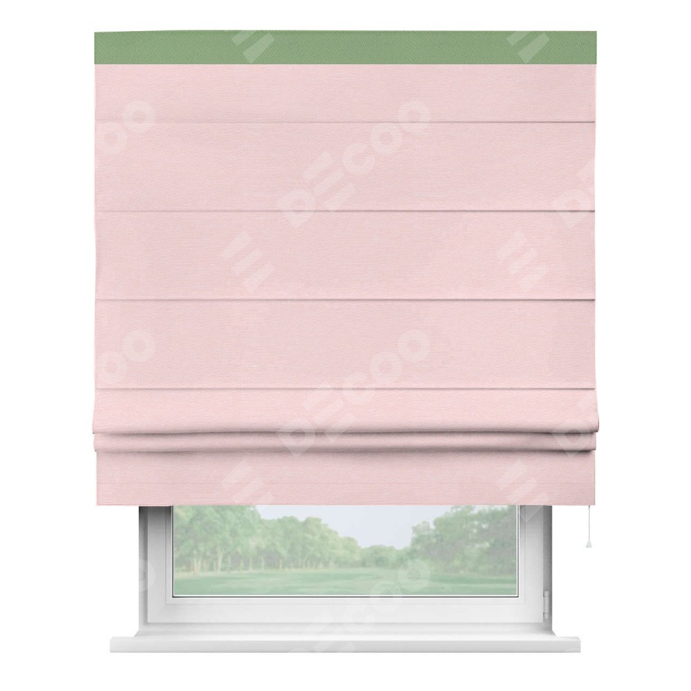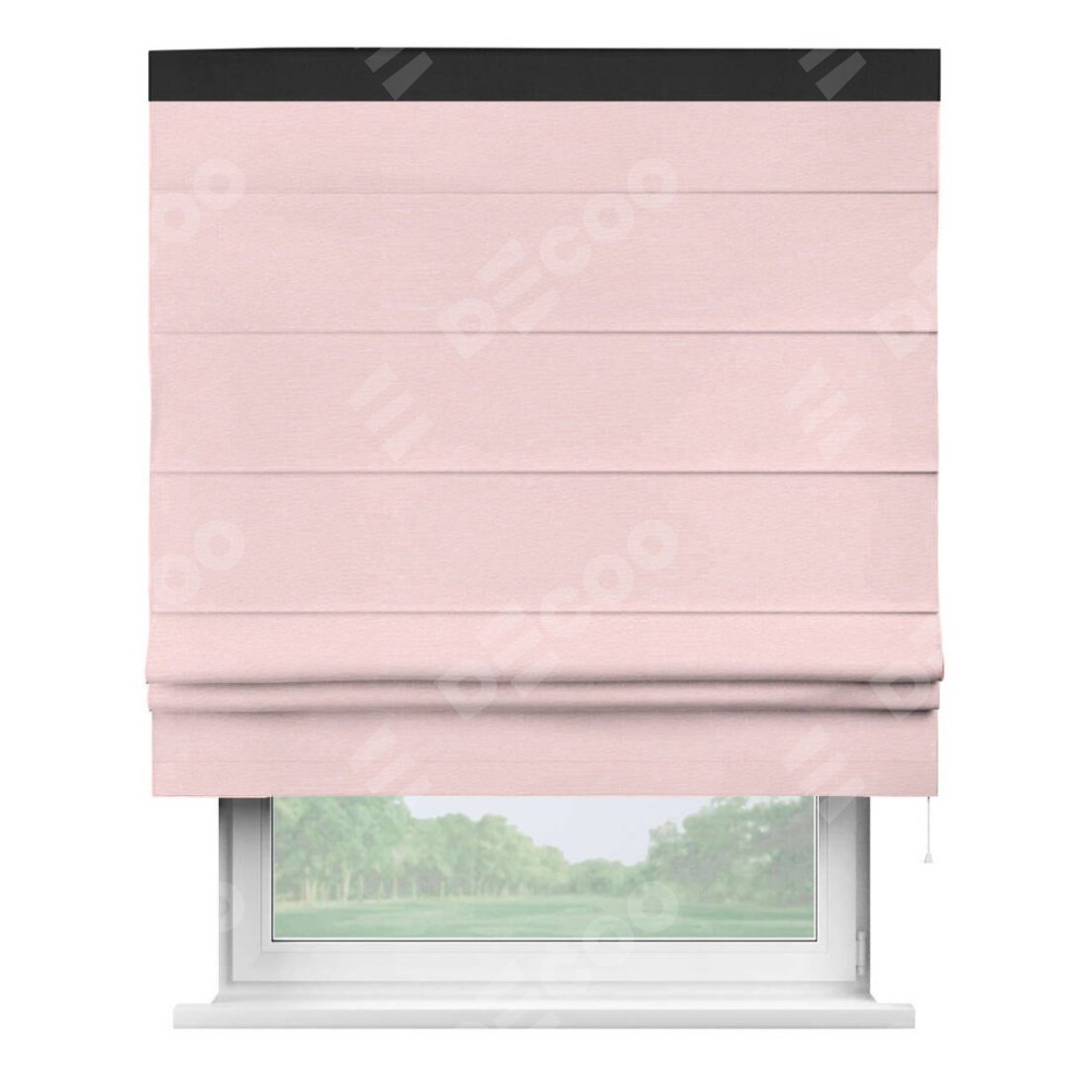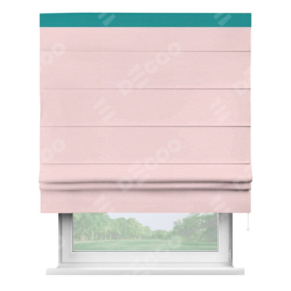 Римская штора производителя «Cortin», используется для проёма, пошита из ткани блэкаут однотонный розовый, артикул ткани 83046. Отделка шторы кантом «Кинг», ткань для канта используется из блэкаута однотонного разной расцветки на выбор. Имеет универсальный механизм и подходит для монтажа: на потолок, на стену и в нишу.