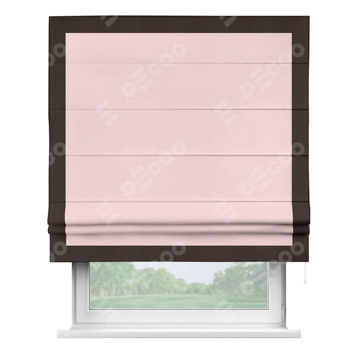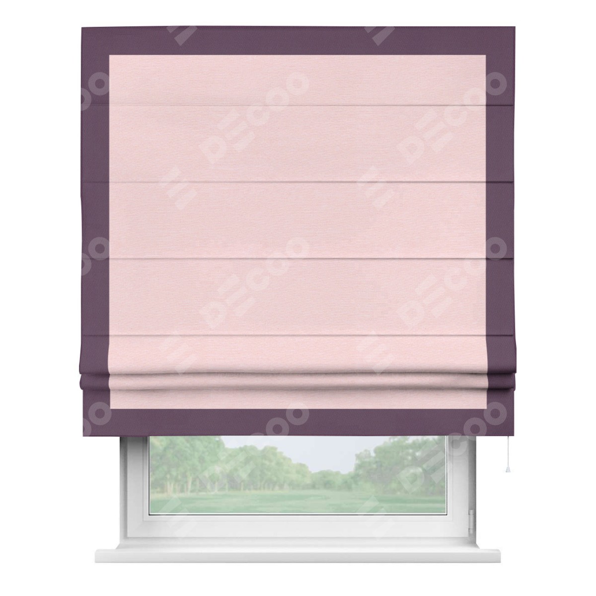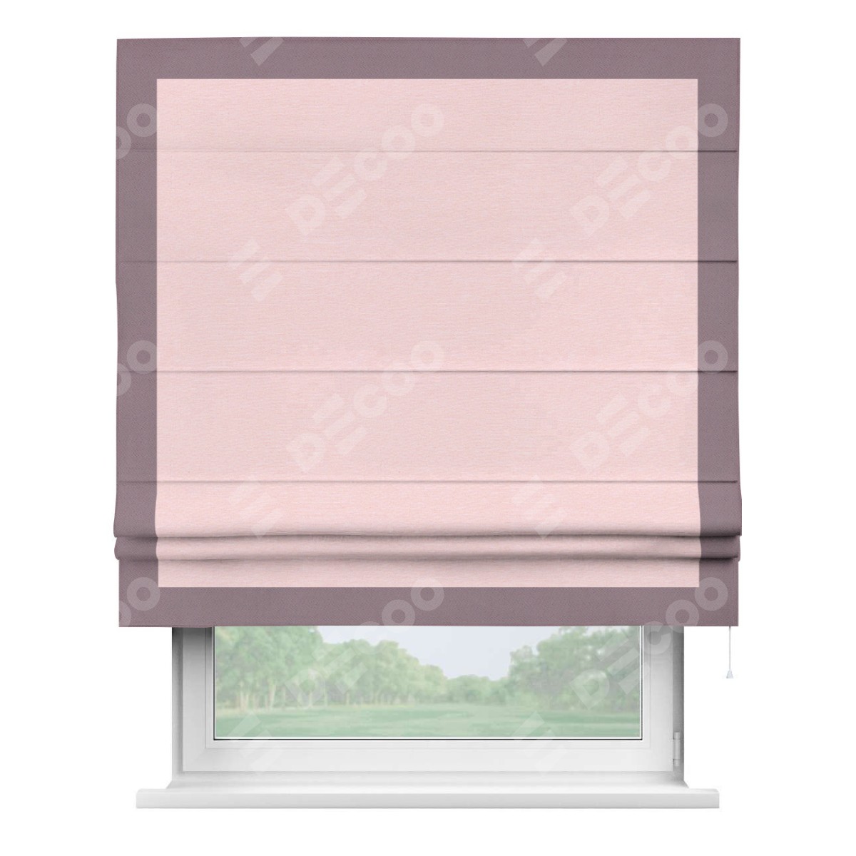 Римская штора производителя «Cortin», используется для проёма, пошита из ткани блэкаут однотонный розовый, артикул ткани 83046. Отделка шторы кантом «Чесс», ткань для канта используется из блэкаута однотонного разной расцветки на выбор. Имеет универсальный механизм и подходит для монтажа: на потолок, на стену и в нишу.