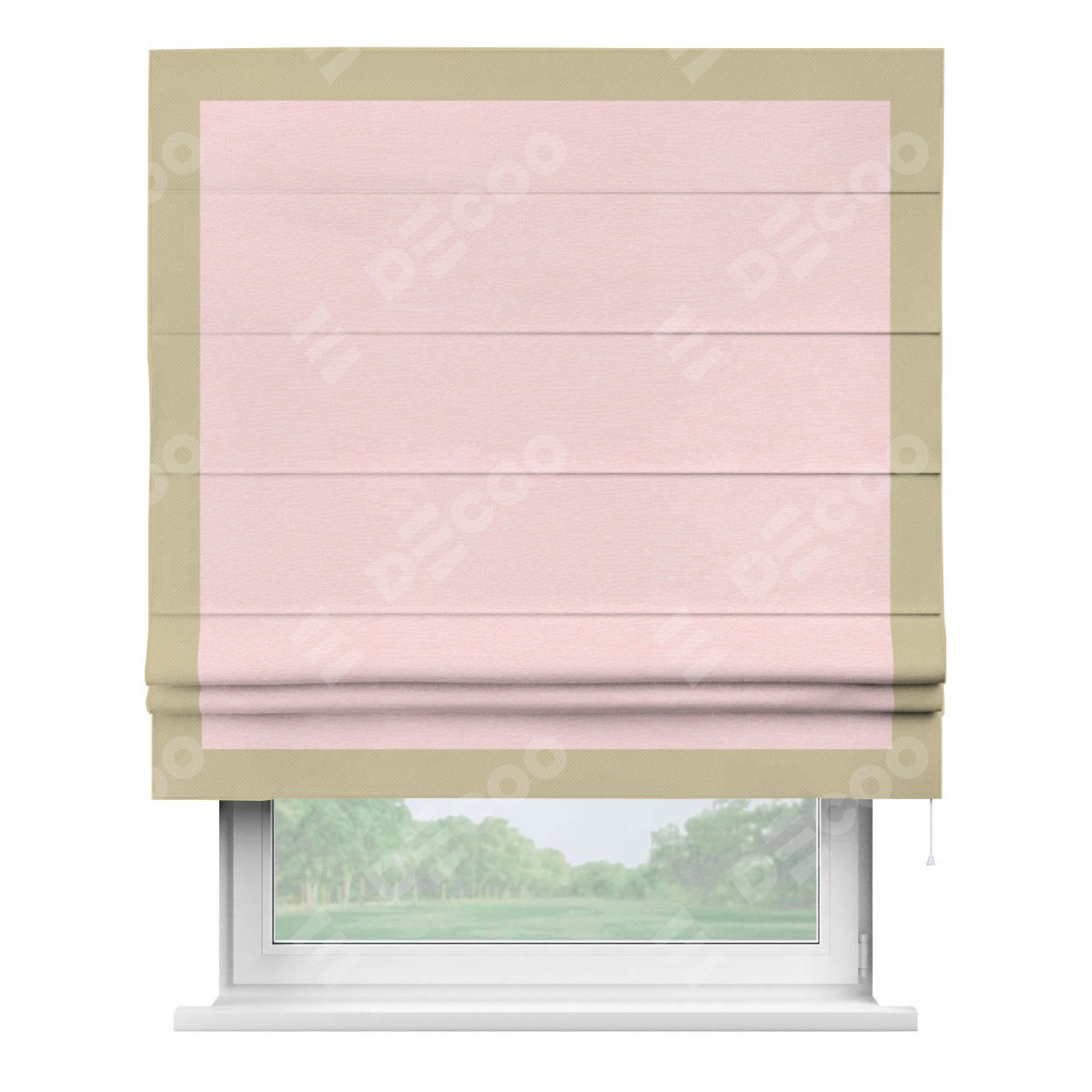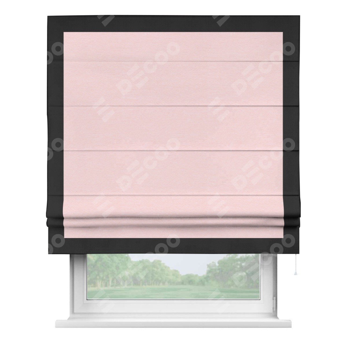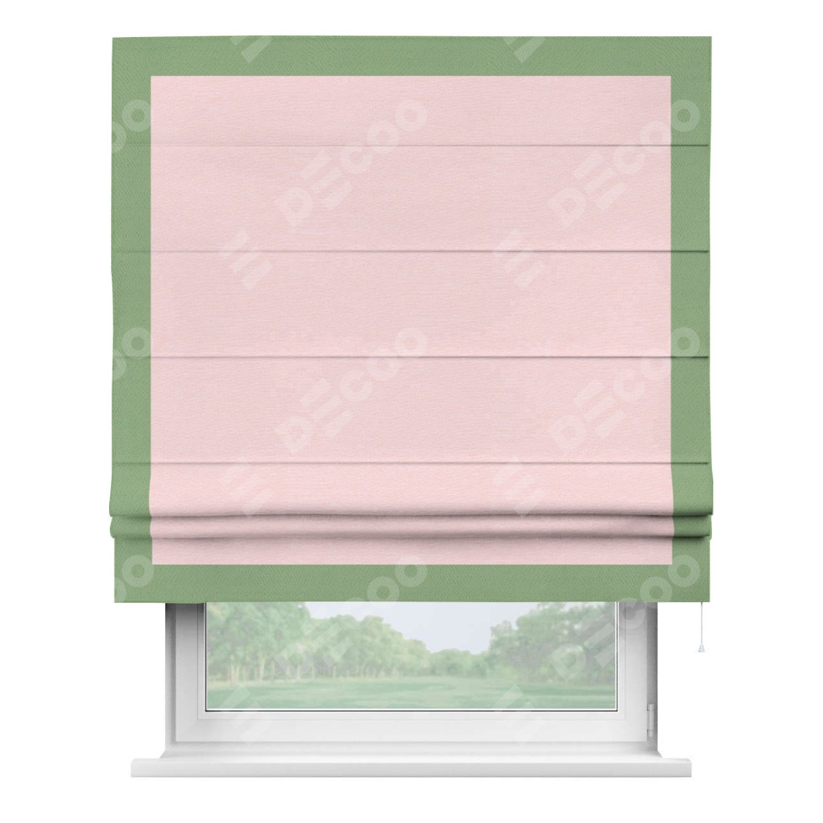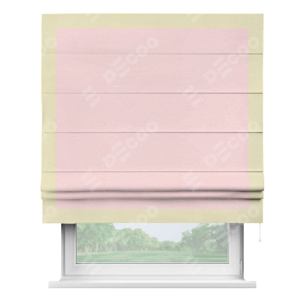 Римская штора производителя «Cortin», используется для проёма, пошита из ткани блэкаут однотонный розовый, артикул ткани 83046. Отделка шторы кантом «Чесс», ткань для канта используется из блэкаута однотонного разной расцветки на выбор. Имеет универсальный механизм и подходит для монтажа: на потолок, на стену и в нишу.