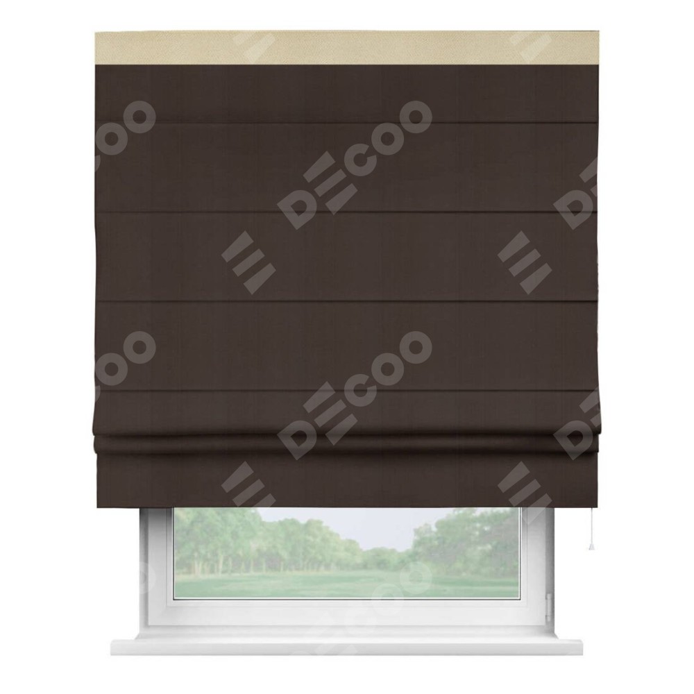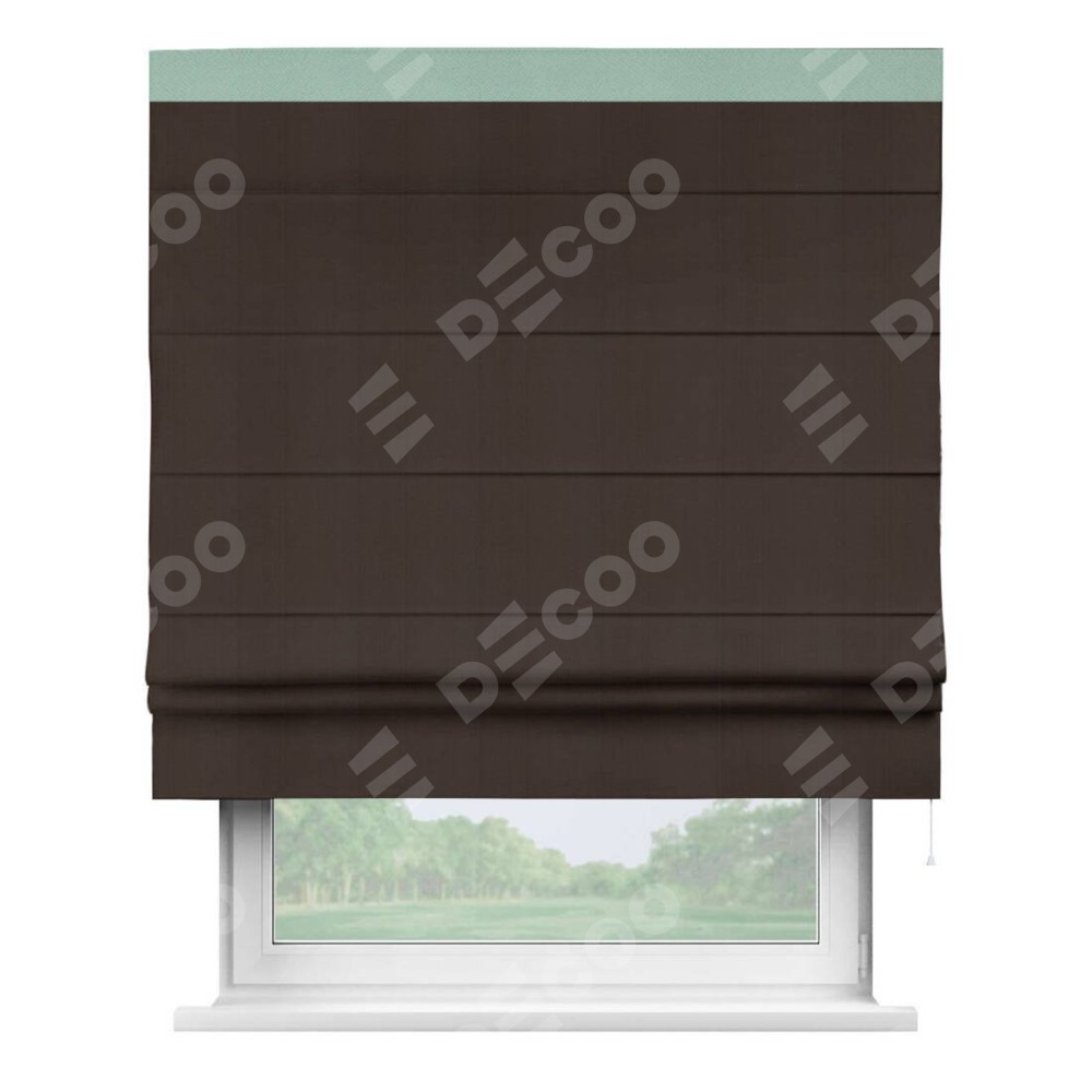 Римская штора производителя «Cortin», используется для проёма, пошита из ткани блэкаут однотонный тёмно-коричневый, артикул ткани 88287. Отделка шторы кантом «Кинг», ткань для канта используется из блэкаута однотонного разной расцветки на выбор. Имеет универсальный механизм и подходит для монтажа: на потолок, на стену и в нишу.