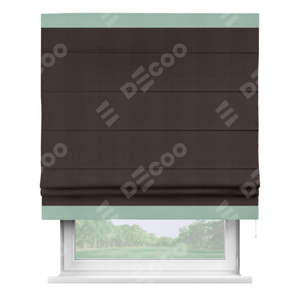 Римская штора производителя «Cortin», используется для проёма, пошита из ткани блэкаут однотонный тёмно-коричневый, артикул ткани 88287. Отделка шторы кантом «Горизонт», ткань для канта используется из блэкаута однотонного разной расцветки на выбор. Имеет универсальный механизм и подходит для монтажа: на потолок, на стену и в нишу.
