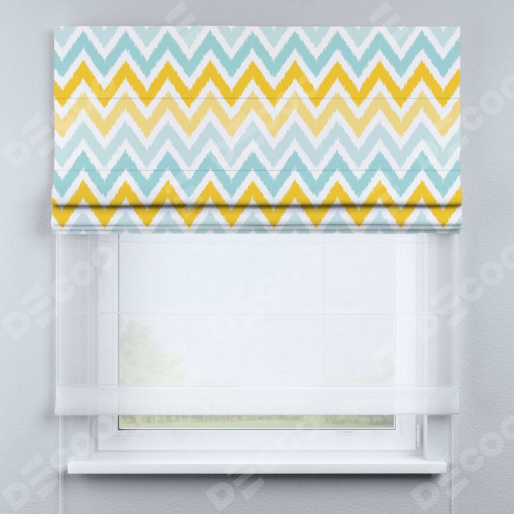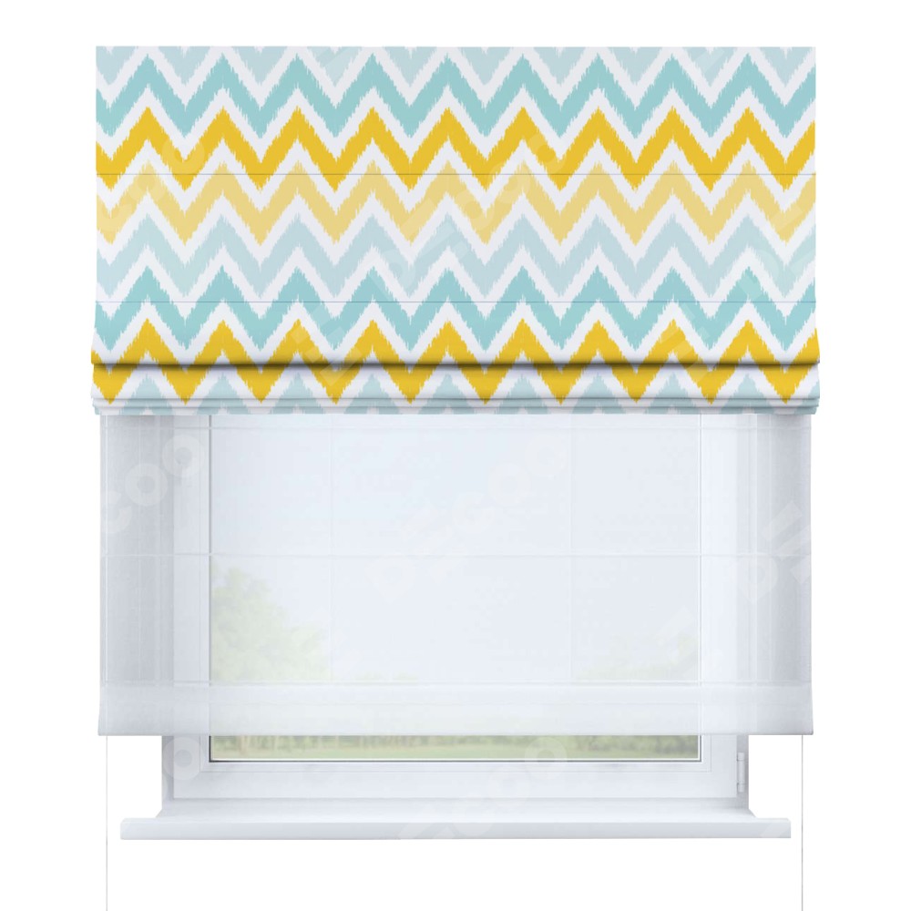 Римская штора день-ночь производителя «Cortin», используется для проёма, пошита из двух полотен, с лицевой блэкаут с нанесением сублимационной печати «Икат шеврон», вторая ткань тюль (по стандарту комплектуется тюль белого цвета артикул V-01). Имеет универсальный механизм и подходит для монтажа: на потолок, на стену и в нишу.