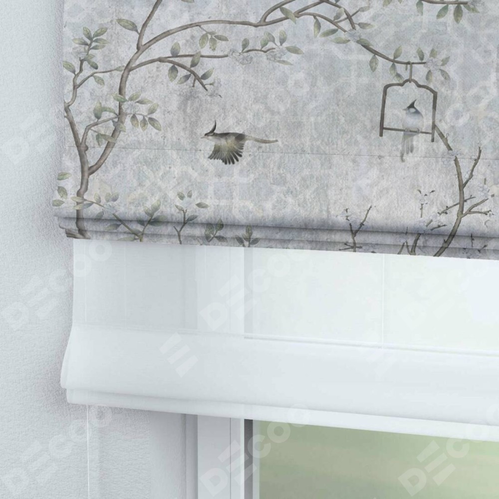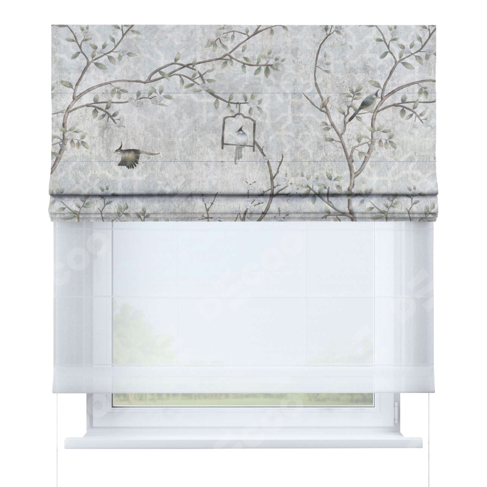 Римская штора день-ночь производителя «Cortin», используется для проёма, пошита из двух полотен, с лицевой блэкаут с нанесением сублимационной печати «Лунный сад», вторая ткань тюль (по стандарту комплектуется тюль белого цвета артикул V-01). Имеет универсальный механизм и подходит для монтажа: на потолок, на стену и в нишу.