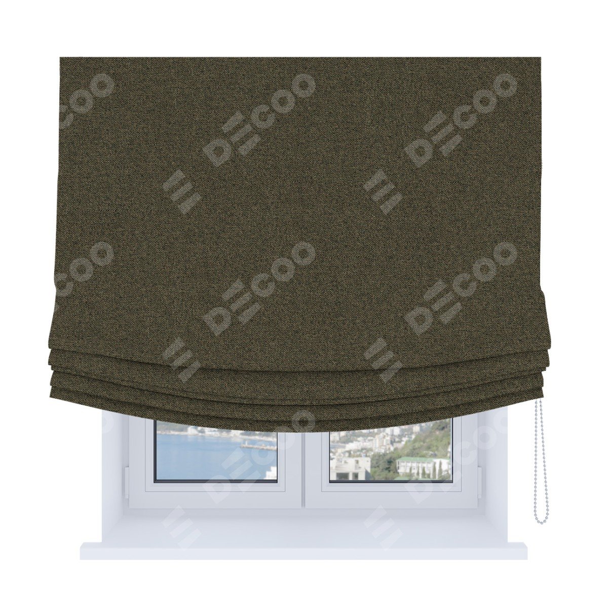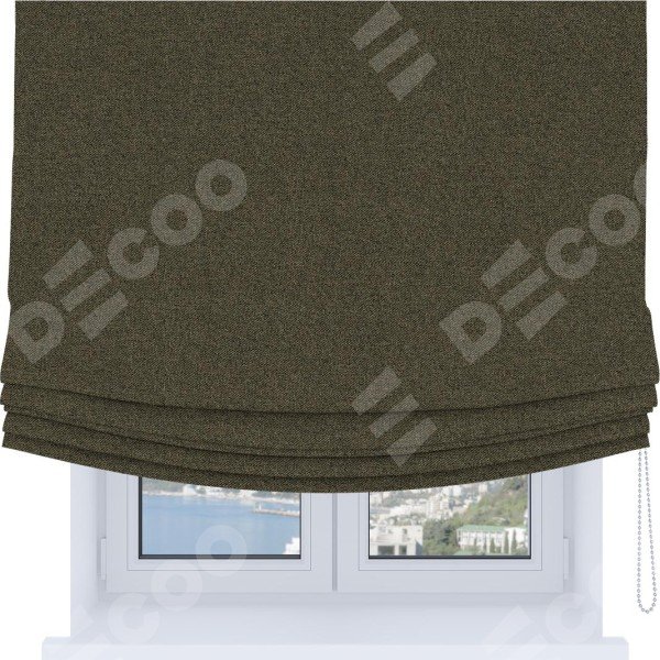 Римская штора Soft производителя «Cortin», используется для проёма, пошита из ткани лён блэкаут коричневый, артикул ткани 69383. Имеет универсальный механизм и подходит для монтажа: на потолок, на стену и в нишу. В отличие от стандартных римских штор, римская штора Soft не имеет горизонтальных вставок и нижнего отвеса. Это позволяет ткани произвольно драпироваться в свободные мягкие складки.