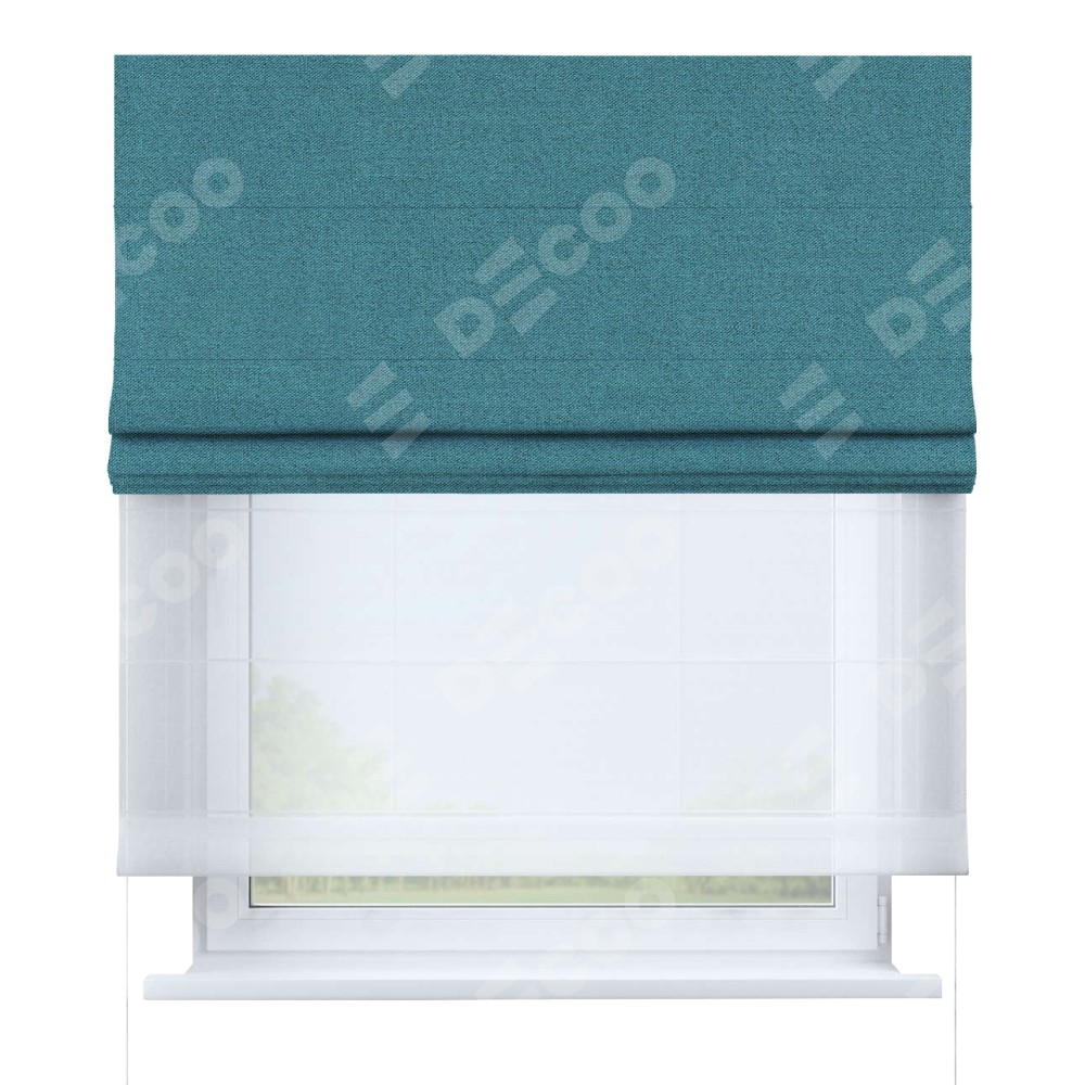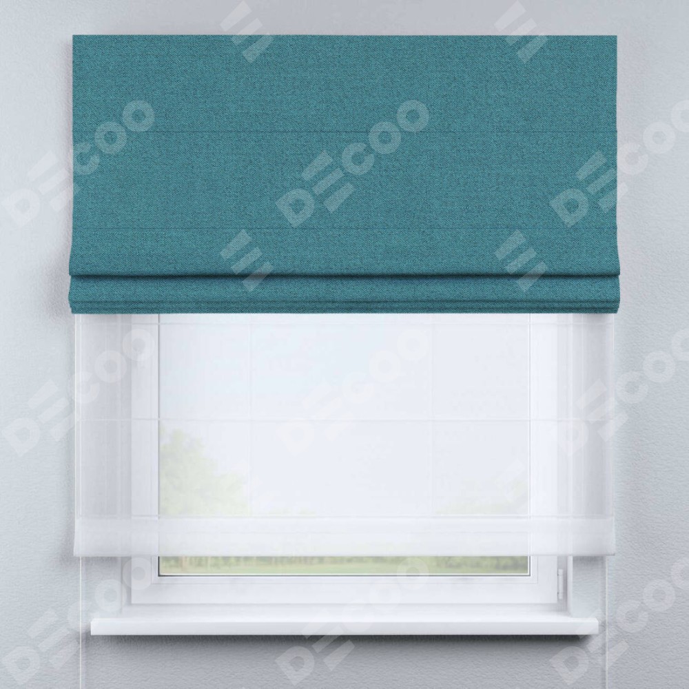 Римская штора день-ночь производителя «Cortin», используется для проёма, пошита из двух полотен, с лицевой стороны лён блэкаут синий артикул 69528, вторая ткань тюль (по стандарту комплектуется тюль белого цвета артикул V-01). Имеет универсальный механизм и подходит для монтажа: на потолок, на стену и в нишу. Удобное управление каждой шторой отдельно.