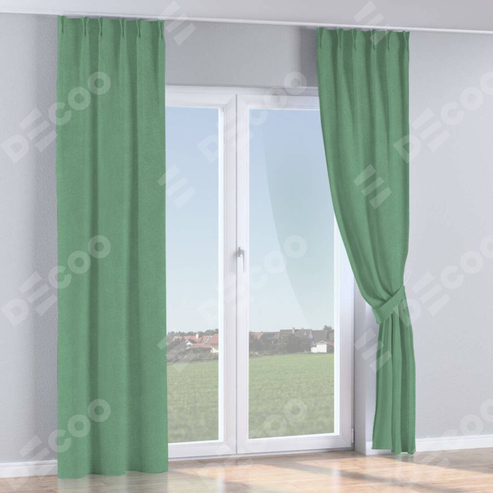 Комплект прямых штор, от производителя «Cortin», пошиты из ткани лён блэкаут светло-бирюзовый, артикул ткани 69443. С изнаночной стороны в верхней части штор пристрачивается шторная лента с декоративными складками «Кустик». Для создания элегантных складок прямые шторы шьются по стандарту с коэффициентом 1:2 (на 100 см. ширины проёма 200 см. ширины ткани).
