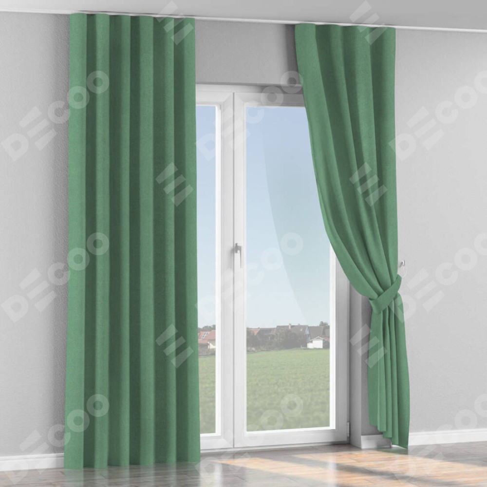Комплект прямых штор, от производителя «Cortin», пошиты из ткани лён блэкаут светло-бирюзовый, артикул ткани 69443. С изнаночной стороны в верхней части штор пристрачивается шторная лента с декоративными складками «Волна». Для создания элегантных складок прямые шторы шьются по стандарту с коэффициентом 1:2 (на 100 см. ширины проёма 200 см. ширины ткани).