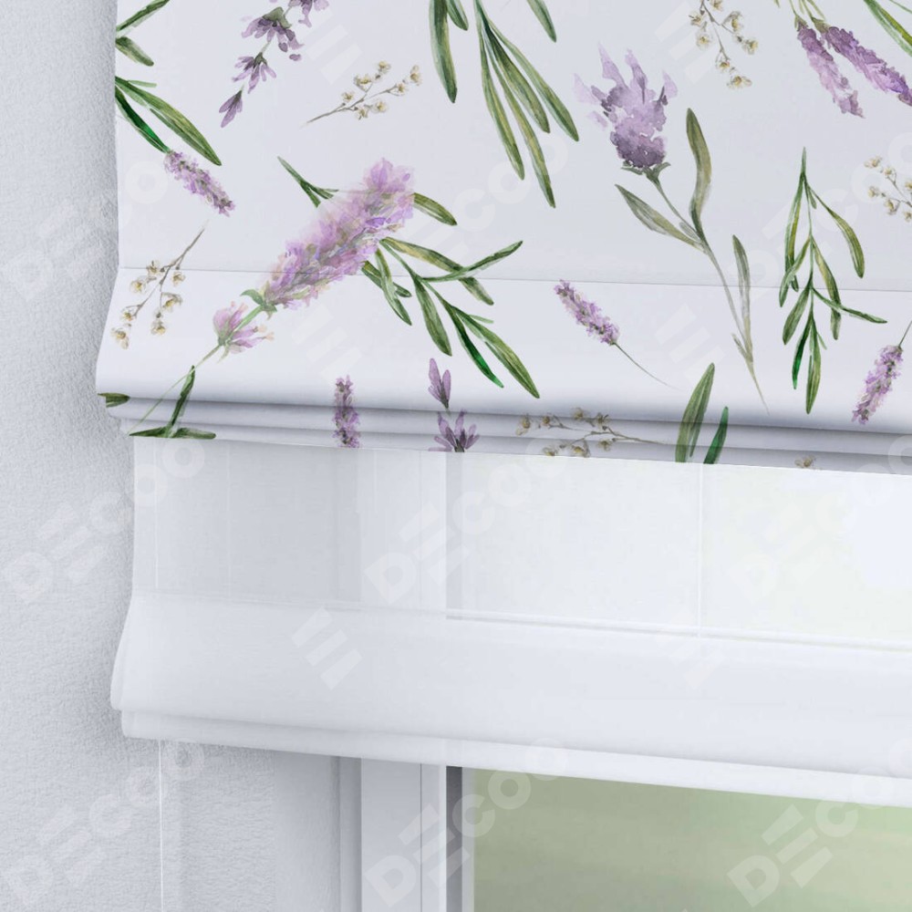 Римская штора день-ночь производителя «Cortin», используется для проёма, пошита из двух полотен, с лицевой блэкаут с нанесением сублимационной печати «Лавандовое поле», вторая ткань тюль (по стандарту комплектуется тюль белого цвета артикул V-01). Имеет универсальный механизм и подходит для монтажа: на потолок, на стену и в нишу.