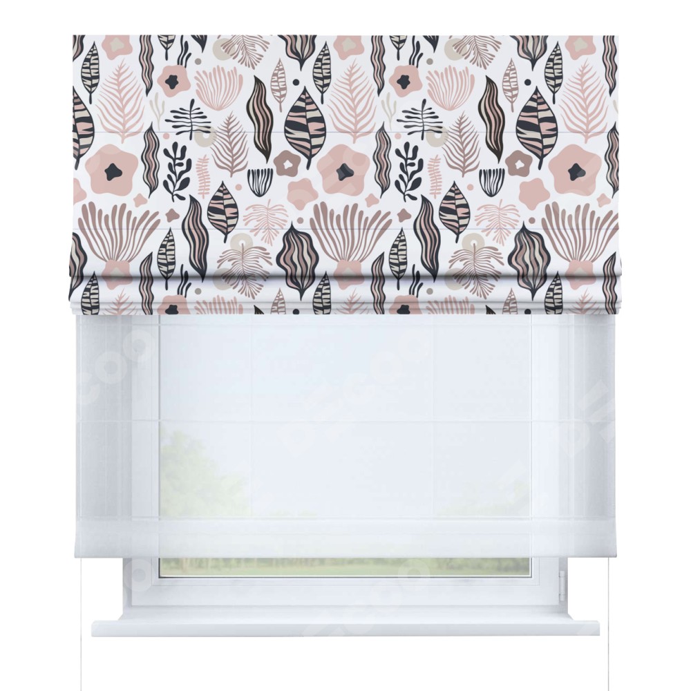 Римская штора день-ночь производителя «Cortin», используется для проёма, пошита из двух полотен, с лицевой блэкаут с нанесением сублимационной печати «Светлый парадиз», вторая ткань тюль (по стандарту комплектуется тюль белого цвета артикул V-01). Имеет универсальный механизм и подходит для монтажа: на потолок, на стену и в нишу.
