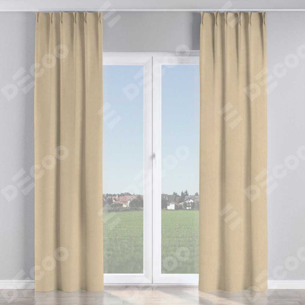 Комплект прямых штор, от производителя «Cortin», пошиты из ткани блэкаут однотонный кофейно-бежевый, артикул ткани 12095−1. С изнаночной стороны в верхней части штор пристрачивается шторная лента с декоративными складками «Кустик». Для создания элегантных складок прямые шторы шьются по стандарту с коэффициентом 1:2 (на 100 см. ширины проёма 200 см. ширины ткани).