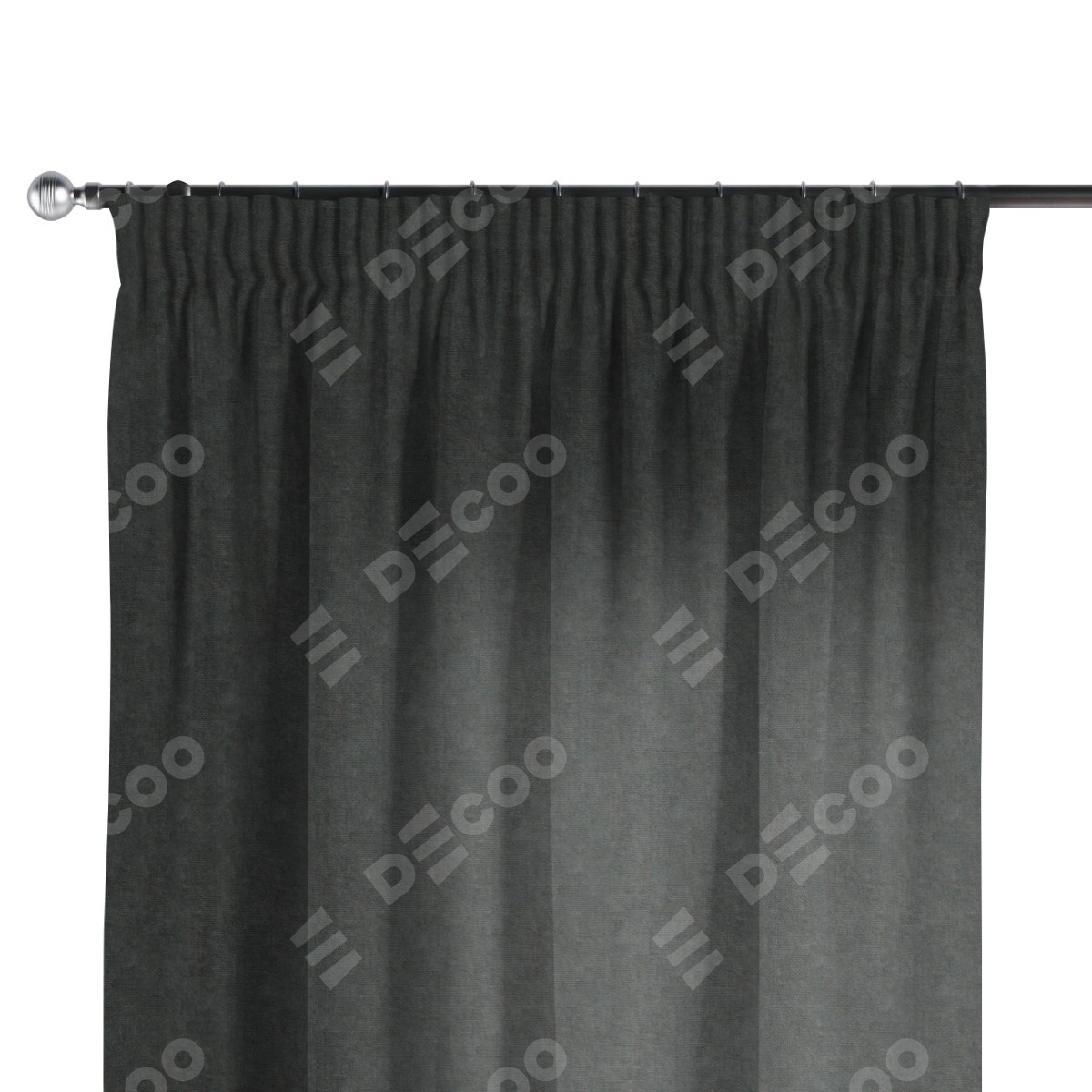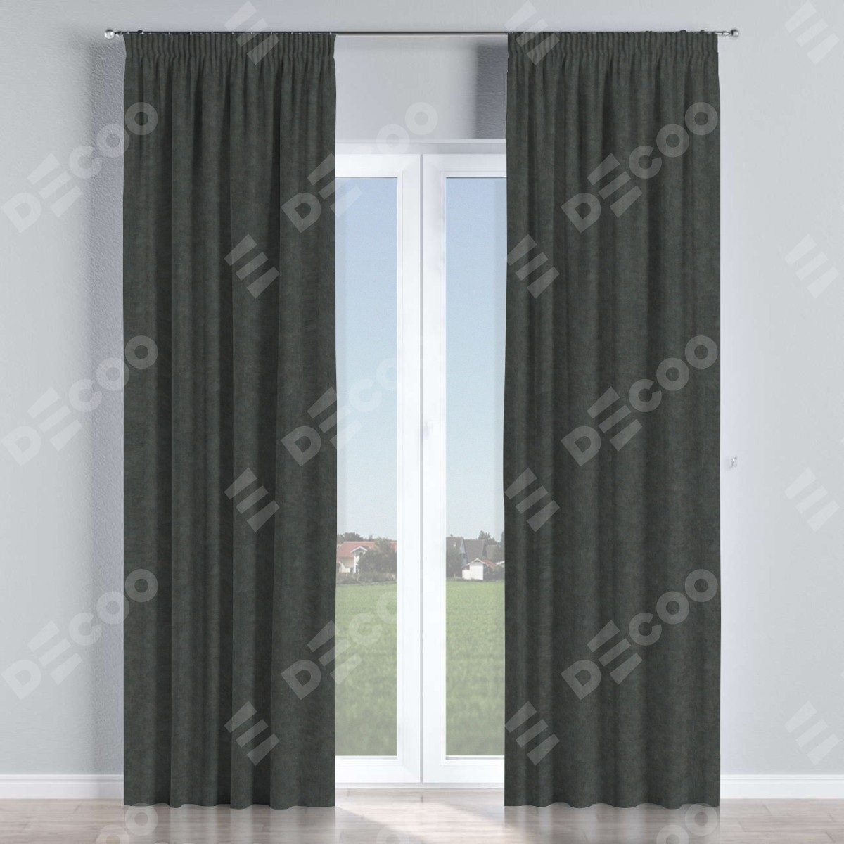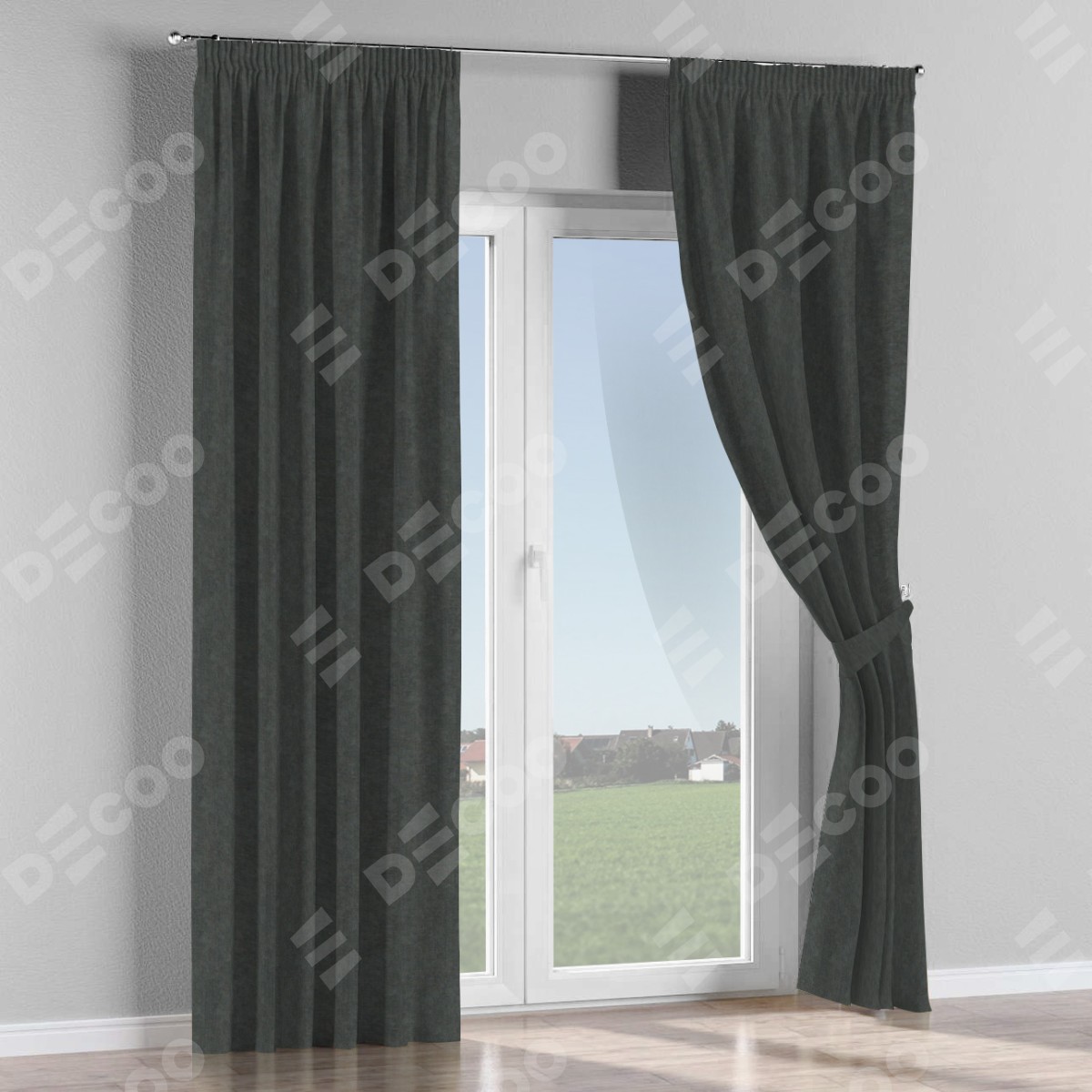 Комплект прямых штор, от производителя «Cortin», пошиты из ткани вельвет тёмно-серый, артикул ткани 33811. С изнаночной стороны в верхней части штор пристрачивается шторная лента с декоративными складками «Карандаш». Для создания элегантных складок прямые шторы шьются по стандарту с коэффициентом 1:2 (на 100 см. ширины проёма 200 см. ширины ткани).
