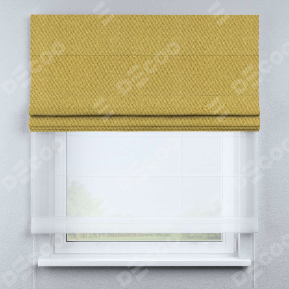 Римская штора день-ночь производителя «Cortin», используется для проёма, пошита из двух полотен, с лицевой стороны твид блэкаут пыльная горчица артикул 21588, вторая ткань тюль (по стандарту комплектуется тюль белого цвета артикул V-01). Имеет универсальный механизм и подходит для монтажа: на потолок, на стену и в нишу.