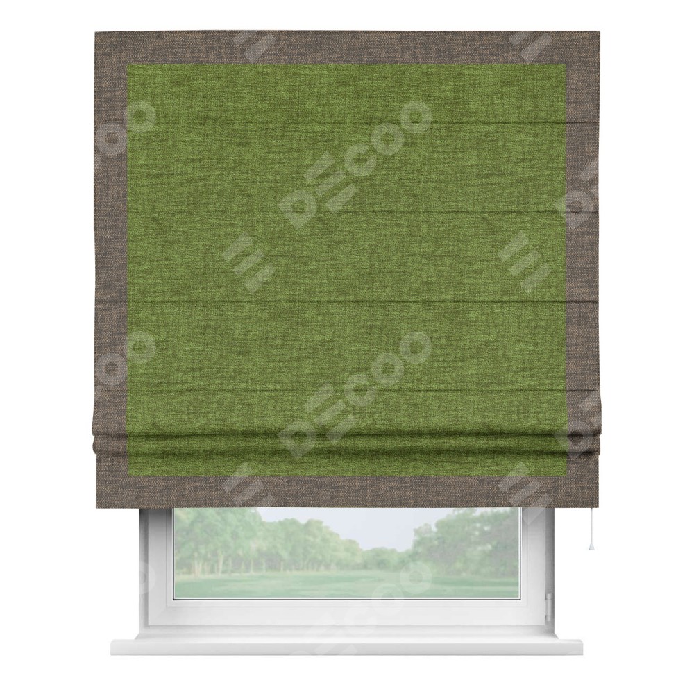 Римская штора производителя «Cortin», используется для проёма, пошита из ткани рогожка димаут салатовый, артикул 80423. Отделка шторы кантом «Чесс», ткань для канта используется из рогожки димаут разной расцветки на выбор. Имеет универсальный механизм и подходит для монтажа: на потолок, на стену и в нишу.