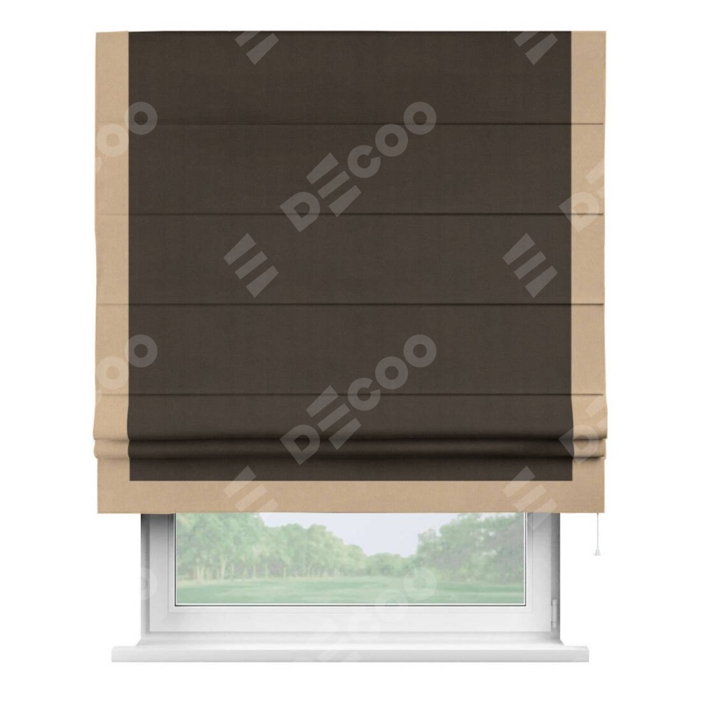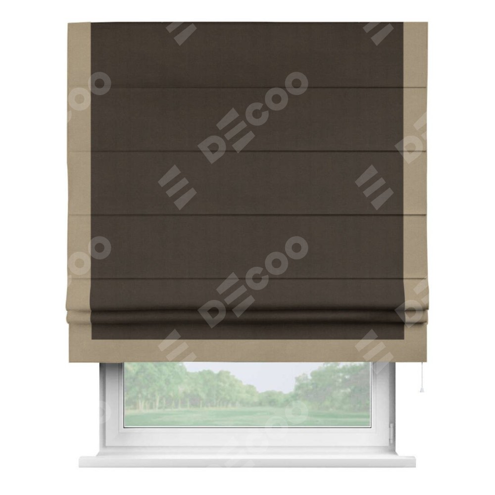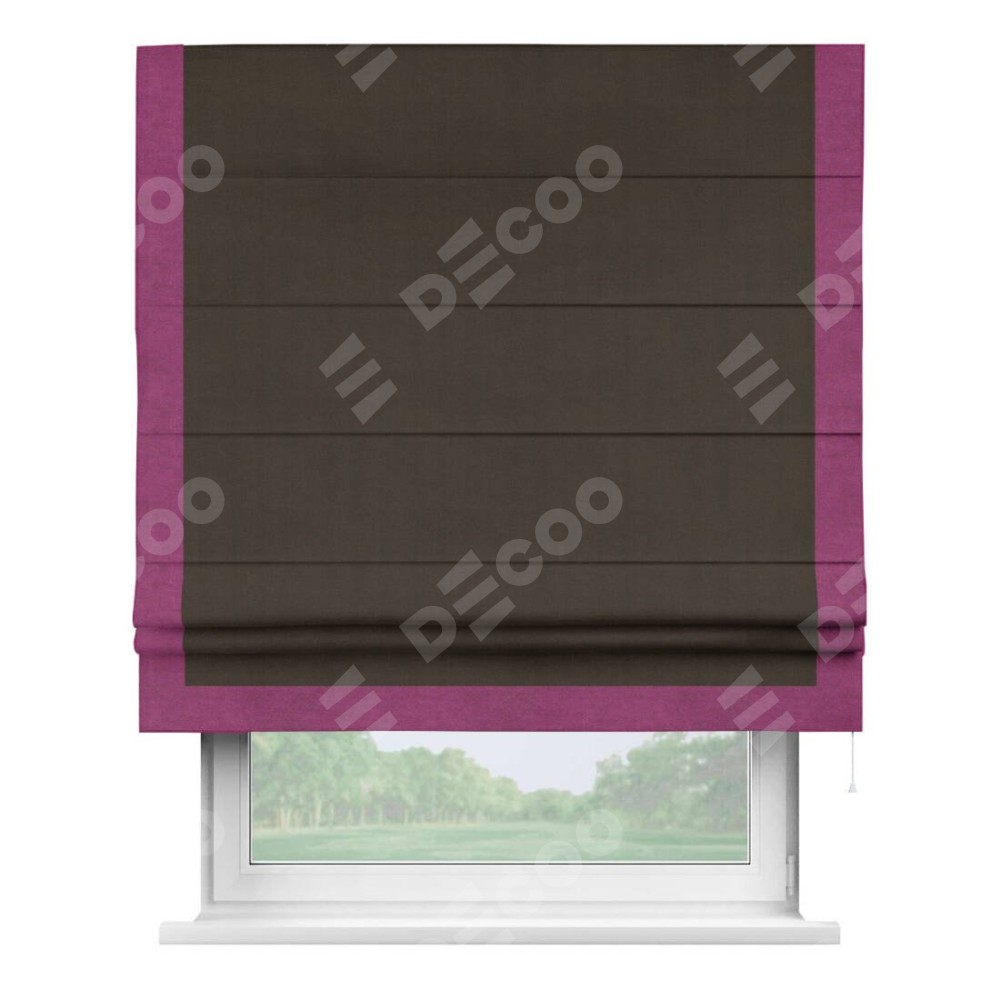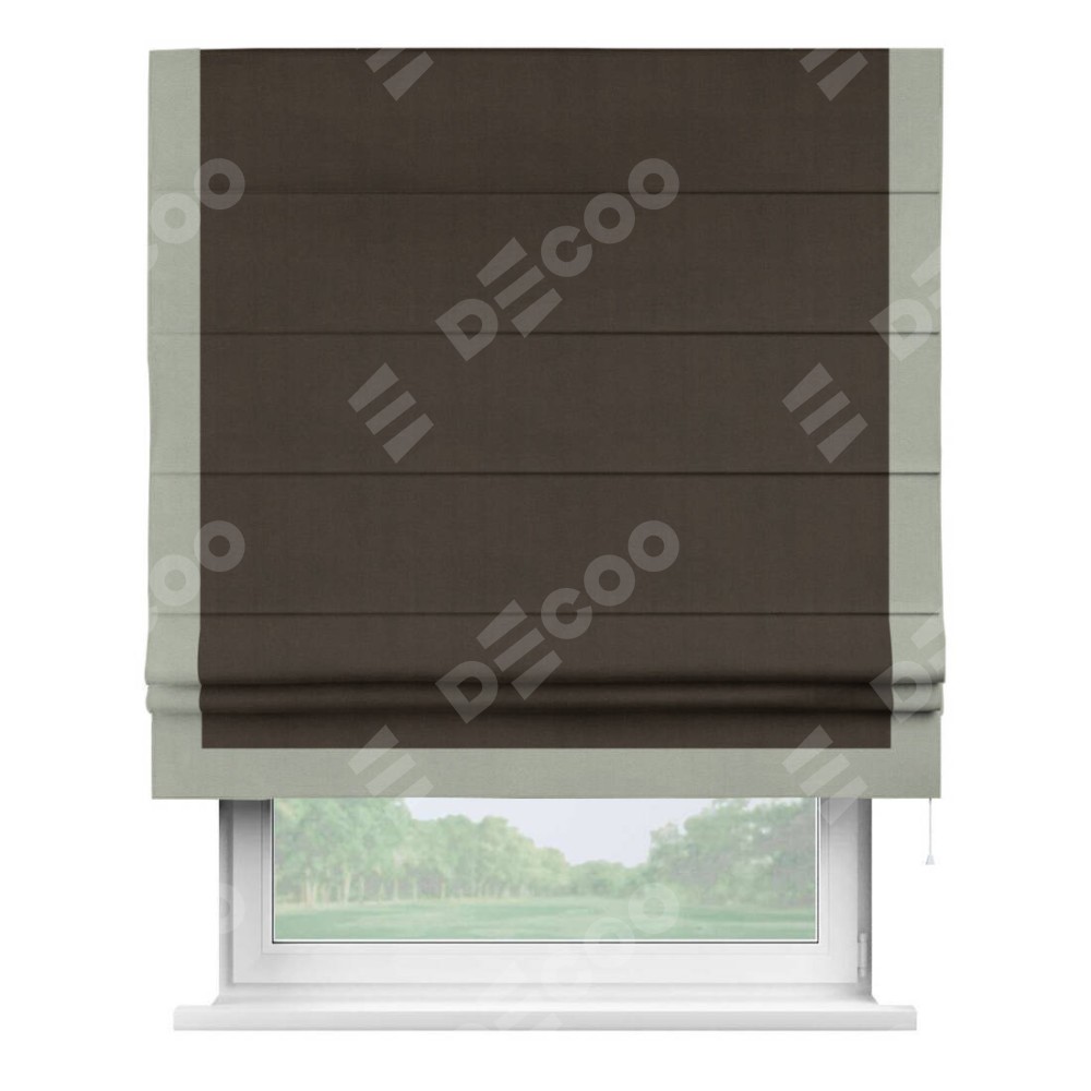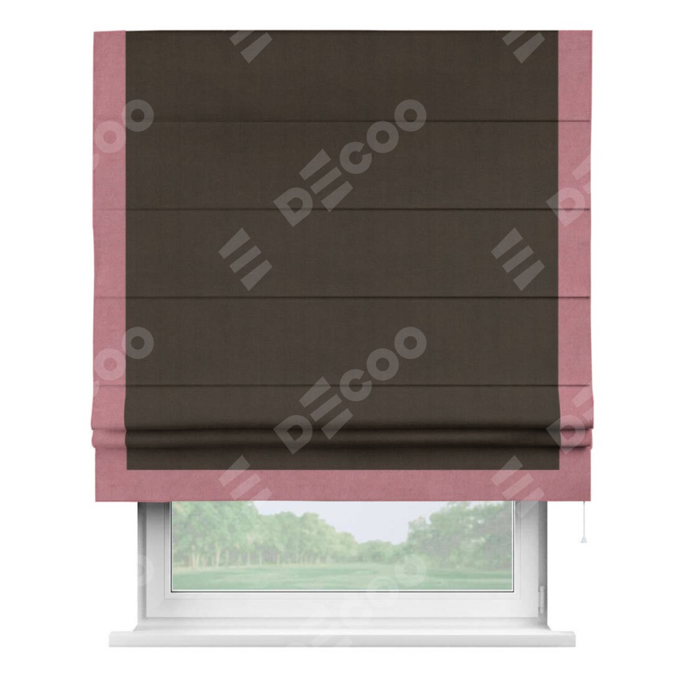 Римская штора производителя «Cortin», используется для проёма, пошита из ткани вельвет тёмно-коричневый, артикул ткани 30991. Отделка шторы кантом «Виктория», ткань для канта используется из вельвета разной расцветки на выбор. Имеет универсальный механизм и подходит для монтажа: на потолок, на стену и в нишу.