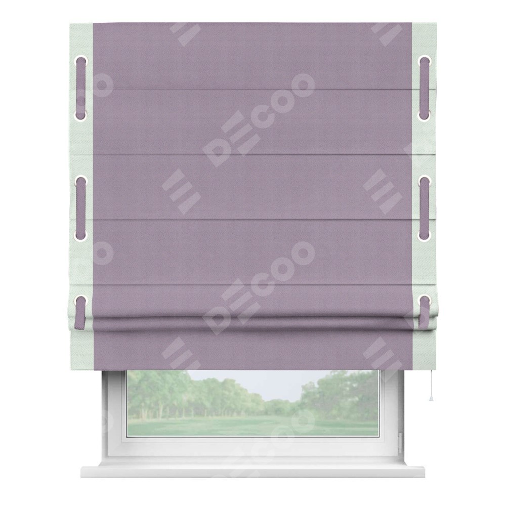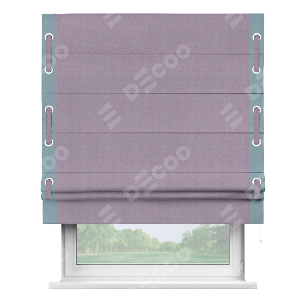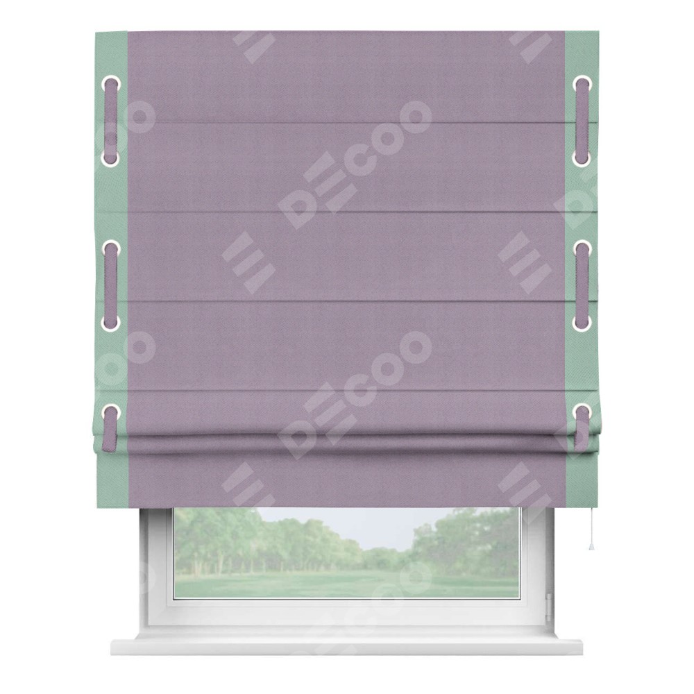 Римская штора производителя «Cortin», используется для проёма, пошита из ткани блэкаут однотонный светло-сиреневый, артикул ткани 29333−1. Отделка шторы кантом «Стрим Дуо» на кантах расположены люверсы с пояском, ткань для канта используется из блэкаута однотонного разной расцветки на выбор. Ткань для пояска обычно используется из основной ткани шторы, а так же можно сделать из любой расцветки по желанию. Имеет универсальный механизм и подходит для монтажа: на потолок, на стену и в нишу.