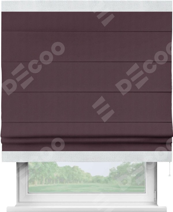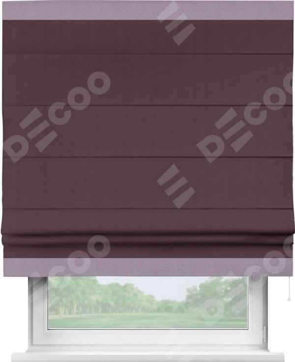 Римская штора производителя «Cortin», используется для проёма, пошита из ткани блэкаут однотонный сиреневый, артикул ткани 29333−2. Отделка шторы кантом «Горизонт», ткань для канта используется из блэкаута однотонного разной расцветки на выбор. Имеет универсальный механизм и подходит для монтажа: на потолок, на стену и в нишу.