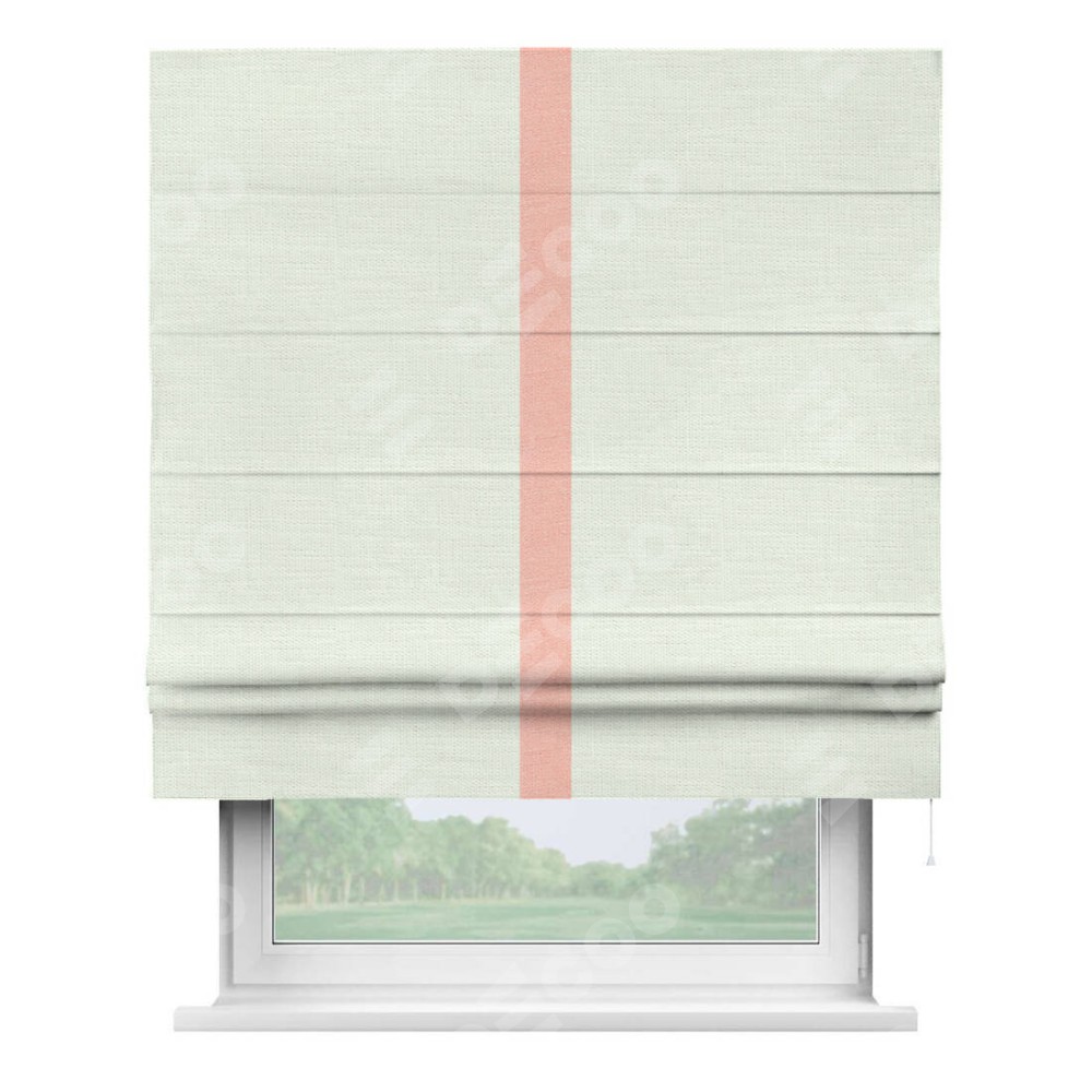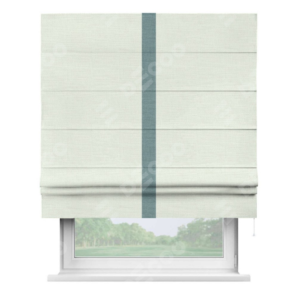 Римская штора производителя «Cortin», используется для проёма, пошита из ткани лён молочный, артикул 23568. Отделка шторы кантом «Хайвэй», ткань для канта используется из льна разной расцветки на выбор. Имеет универсальный механизм и подходит для монтажа: на потолок, на стену и в нишу.