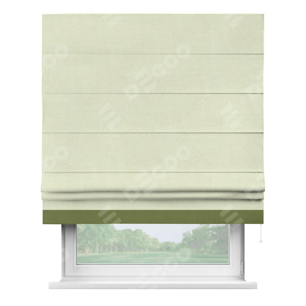Римская штора производителя «Cortin», используется для проёма, пошита из ткани блэкаут однотонный сливочный, артикул ткани 6668−02. Отделка шторы кантом «Джестер», ткань для канта используется из блэкаута однотонного разной расцветки на выбор. Имеет универсальный механизм и подходит для монтажа: на потолок, на стену и в нишу.