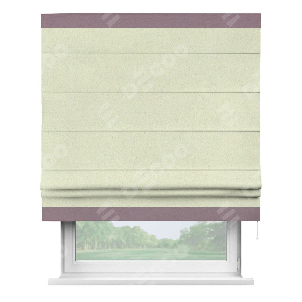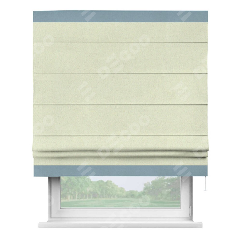 Римская штора производителя «Cortin», используется для проёма, пошита из ткани блэкаут однотонный сливочный, артикул ткани 6668−02. Отделка шторы кантом «Горизонт», ткань для канта используется из блэкаута однотонного разной расцветки на выбор. Имеет универсальный механизм и подходит для монтажа: на потолок, на стену и в нишу.
