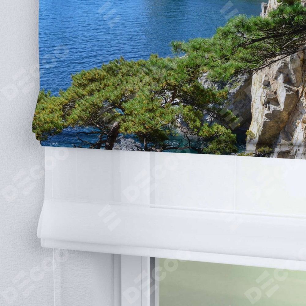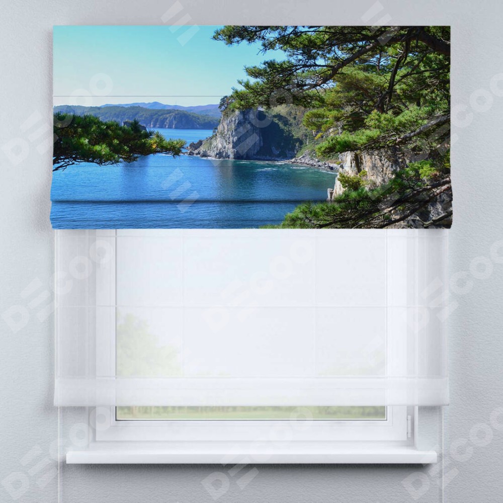 Римская штора день-ночь производителя «Cortin», используется для проёма, пошита из двух полотен, с лицевой блэкаут с нанесением сублимационной печати «Море и сосны», вторая ткань тюль (по стандарту комплектуется тюль белого цвета артикул V-01). Имеет универсальный механизм и подходит для монтажа: на потолок, на стену и в нишу.