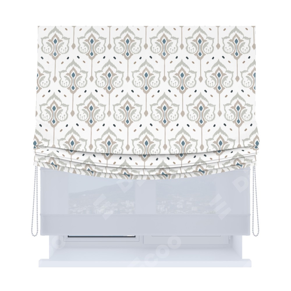 Римская штора день-ночь производителя «Cortin», используется для проёма, пошита из двух полотен, с лицевой блэкаут с нанесением сублимационной печати «Икат узор», вторая ткань тюль (по стандарту комплектуется тюль белого цвета артикул V-01). Имеет универсальный механизм и подходит для монтажа: на потолок, на стену и в нишу. Удобное управление каждой шторой отдельно.