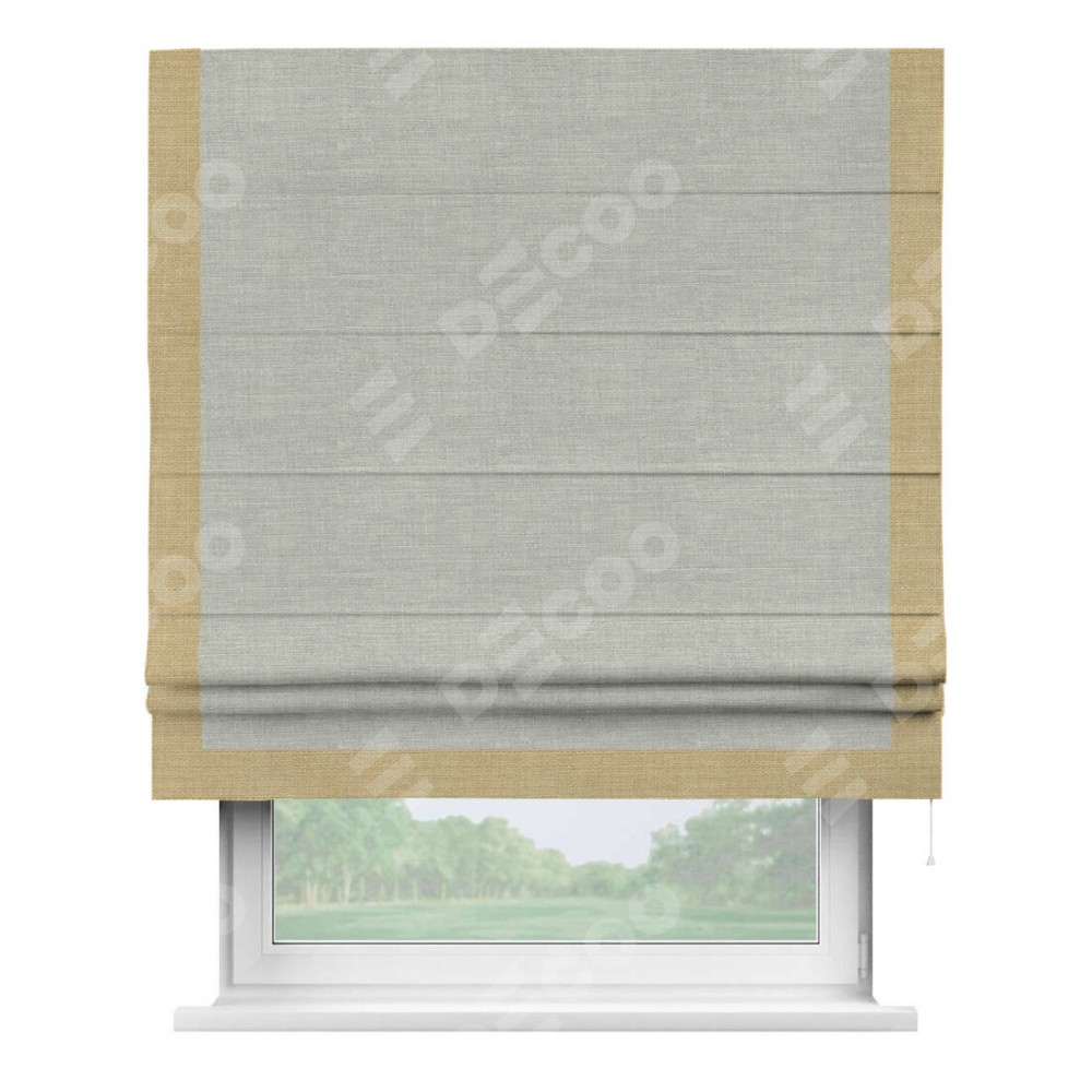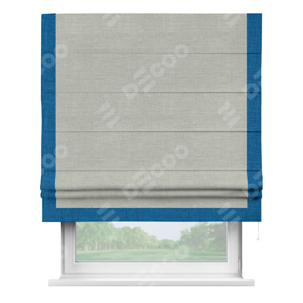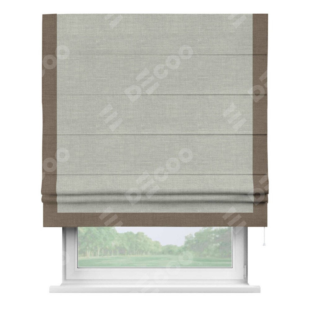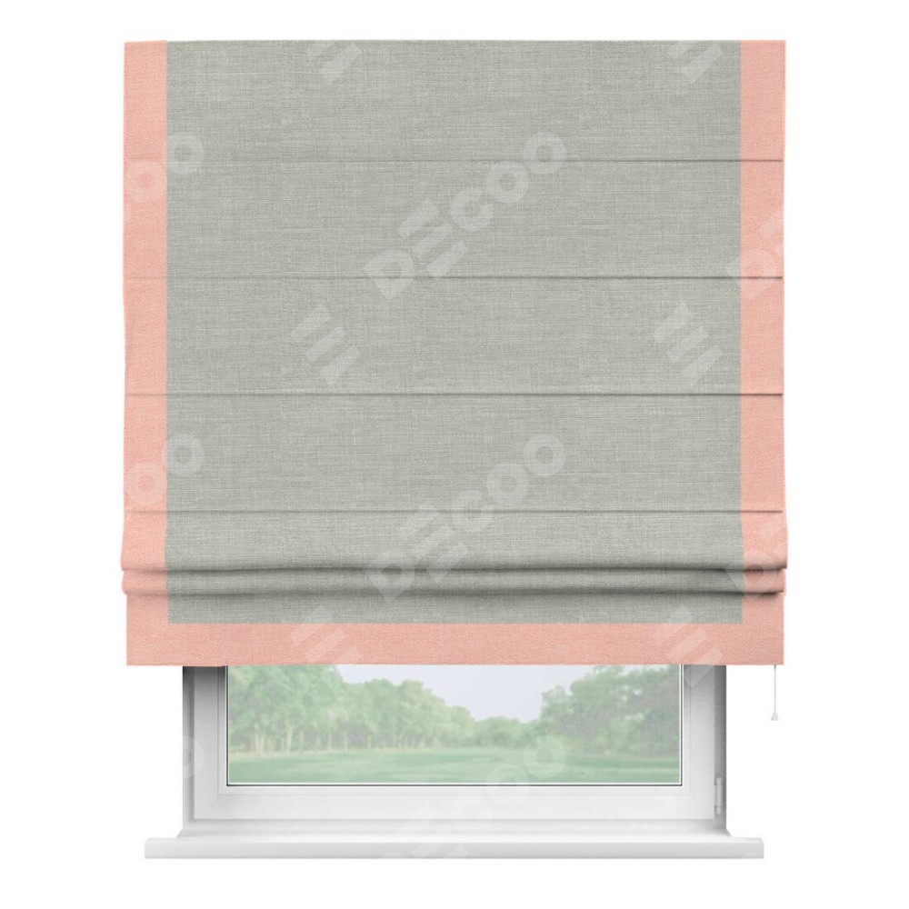 Римская штора производителя «Cortin», используется для проёма, пошита из ткани лён серый, артикул 7440. Отделка шторы кантом «Виктория», ткань для канта используется из льна разной расцветки на выбор. Имеет универсальный механизм и подходит для монтажа: на потолок, на стену и в нишу.