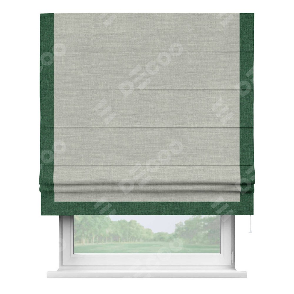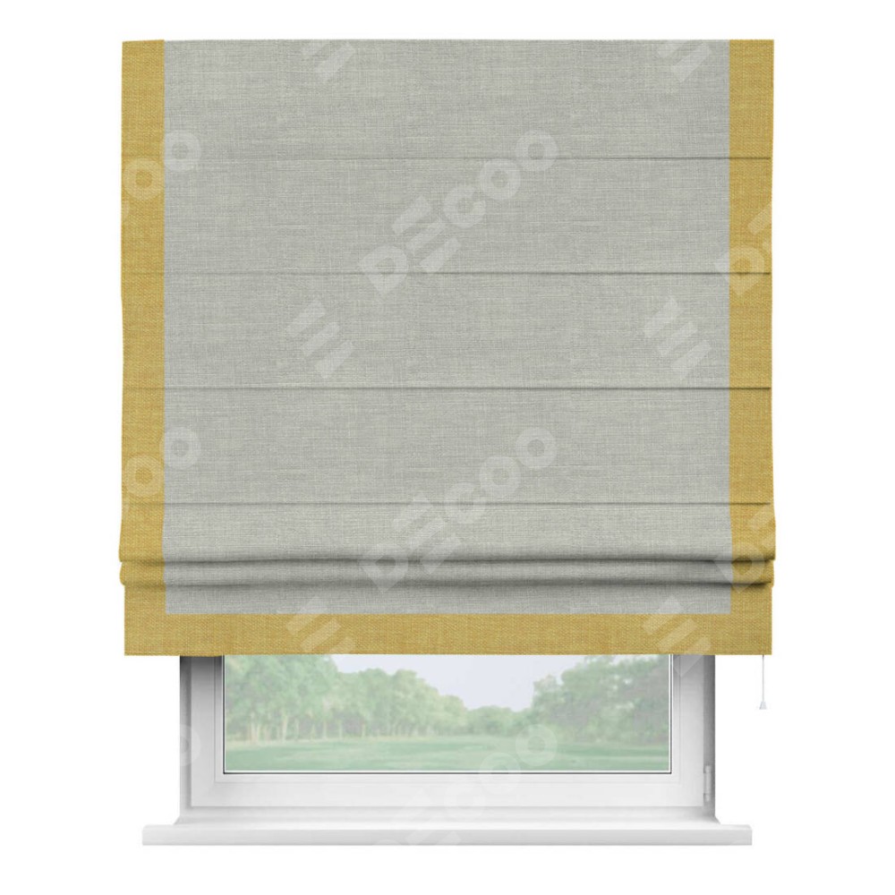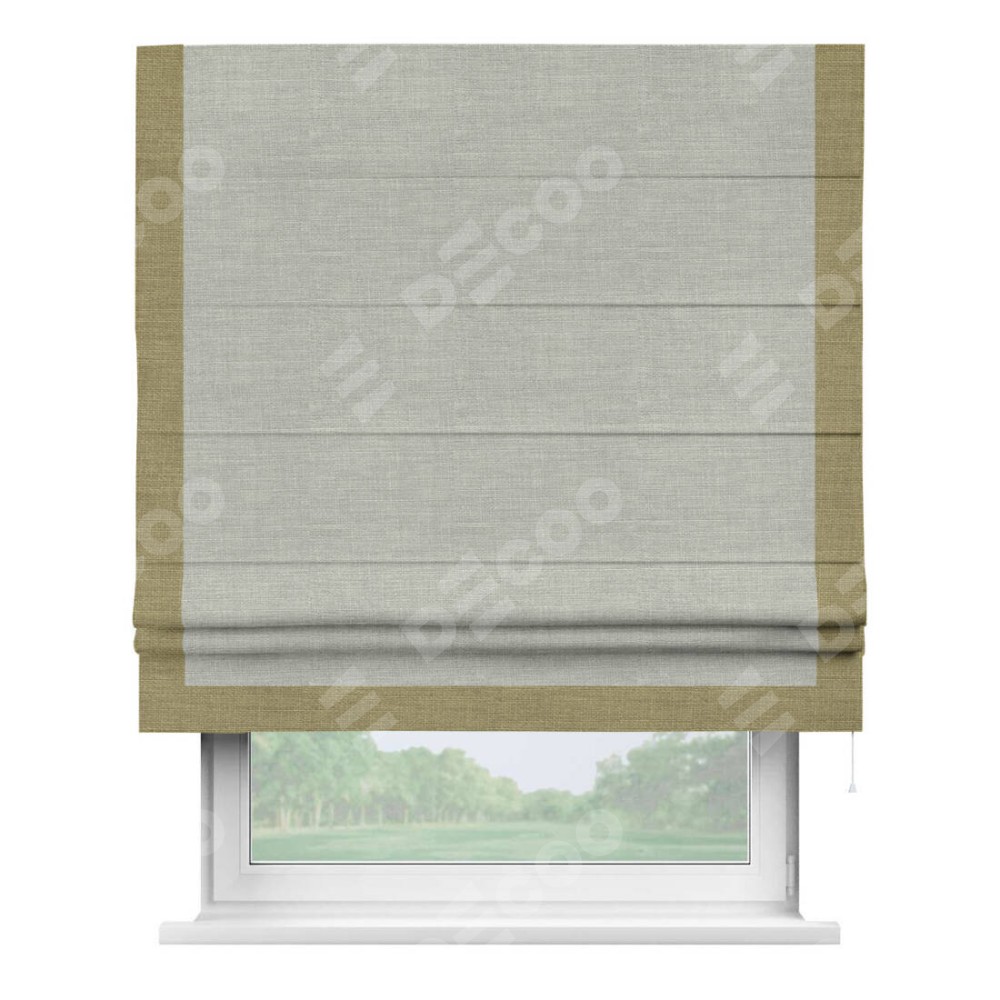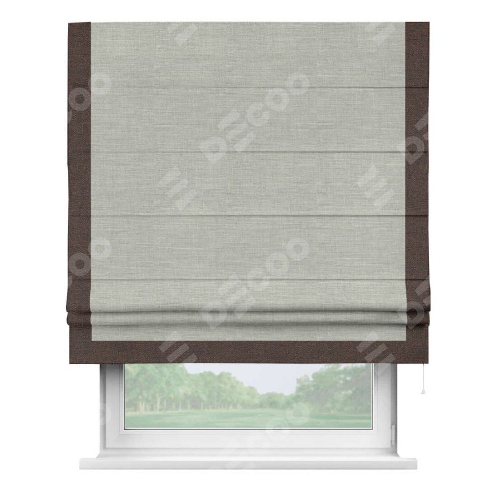 Римская штора производителя «Cortin», используется для проёма, пошита из ткани лён серый, артикул 7440. Отделка шторы кантом «Виктория», ткань для канта используется из льна разной расцветки на выбор. Имеет универсальный механизм и подходит для монтажа: на потолок, на стену и в нишу.