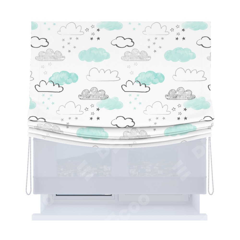 Римская штора день-ночь производителя «Cortin», используется для проёма, пошита из двух полотен, с лицевой блэкаут с нанесением сублимационной печати «Облака и звёзды», вторая ткань тюль (по стандарту комплектуется тюль белого цвета артикул V-01). Имеет универсальный механизм и подходит для монтажа: на потолок, на стену и в нишу. Удобное управление каждой шторой отдельно.