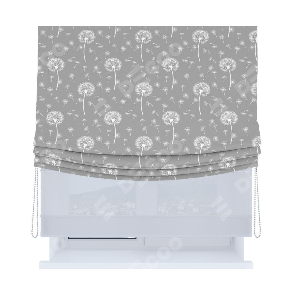 Римская штора день-ночь производителя «Cortin», используется для проёма, пошита из двух полотен, с лицевой блэкаут с нанесением сублимационной печати «Одуванчики», вторая ткань тюль (по стандарту комплектуется тюль белого цвета артикул V-01). Имеет универсальный механизм и подходит для монтажа: на потолок, на стену и в нишу. Удобное управление каждой шторой отдельно.