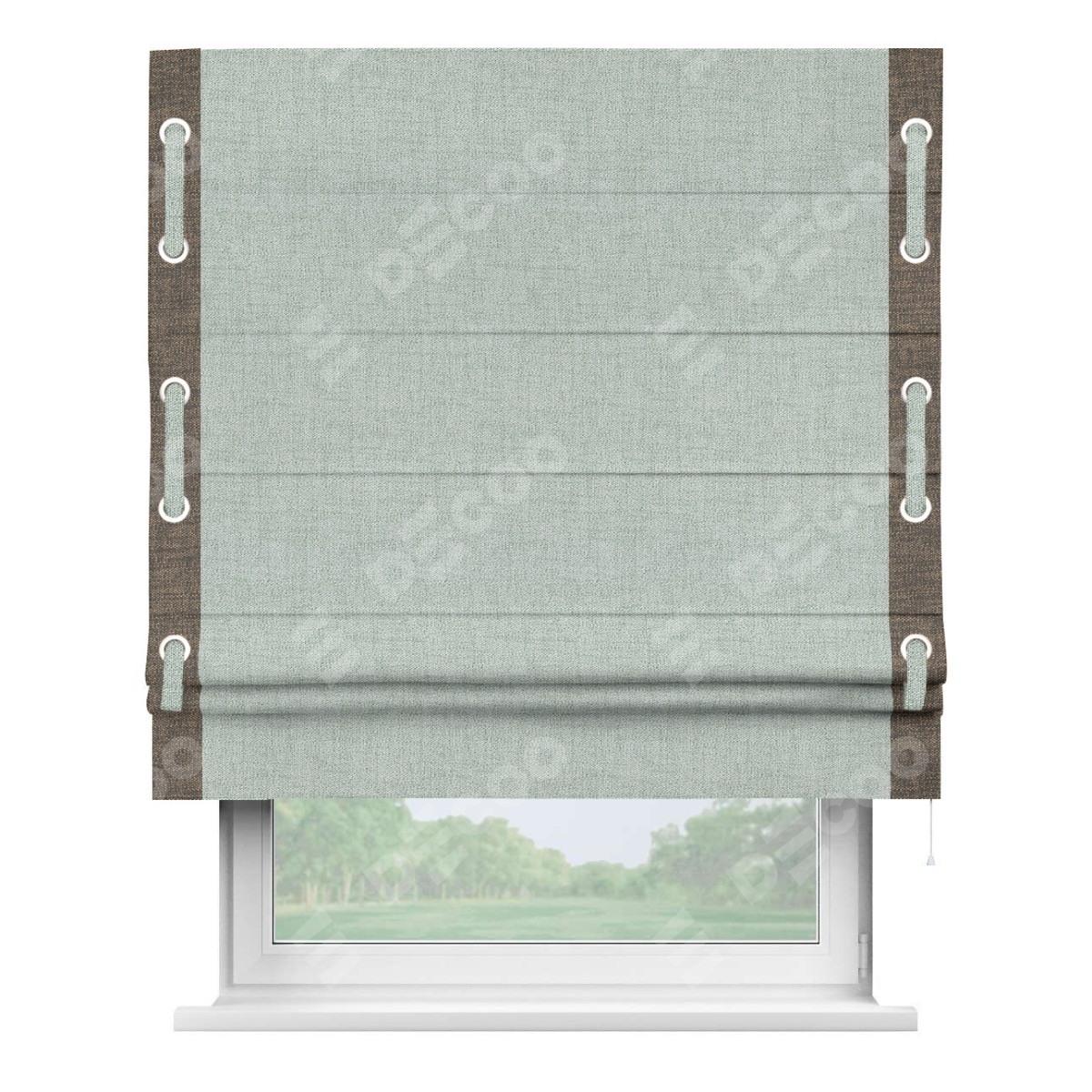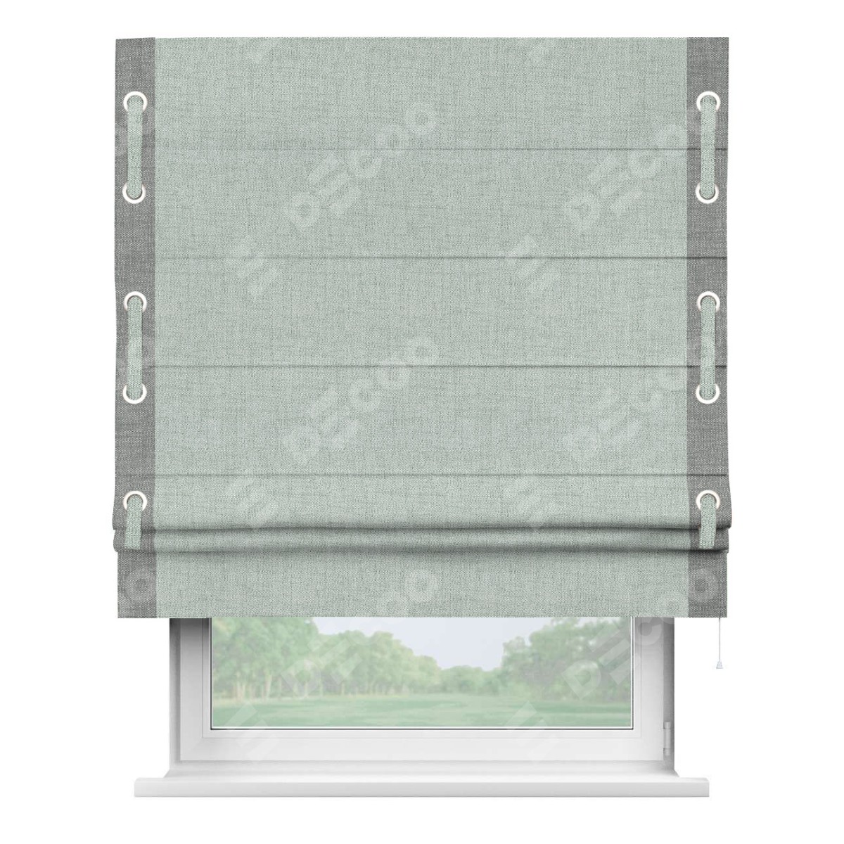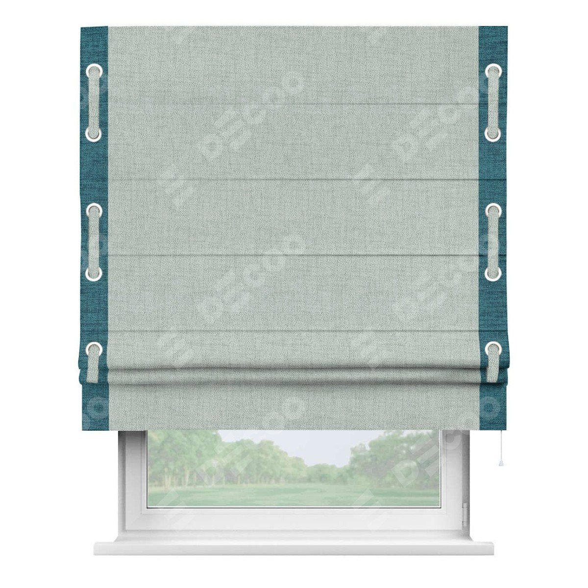 Римская штора производителя «Cortin», используется для проёма, пошита из ткани рогожка димаут серый, артикул 80426. Отделка шторы кантом «Стрим Дуо» на кантах расположены люверсы с пояском, ткань для канта используется из рогожки разной расцветки на выбор. Ткань для пояска обычно используется из основной ткани шторы, а так же можно сделать из любой расцветки по желанию. Имеет универсальный механизм и подходит для монтажа: на потолок, на стену и в нишу.
