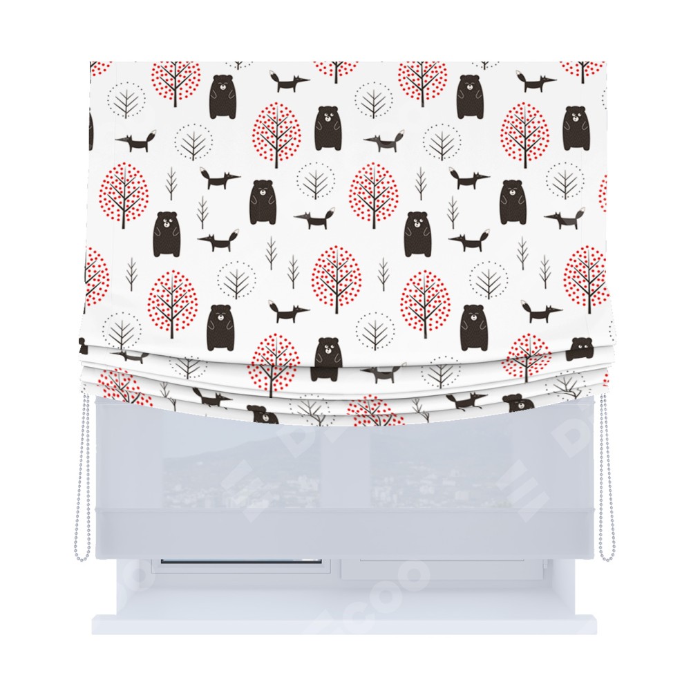 Римская штора день-ночь производителя «Cortin», используется для проёма, пошита из двух полотен, с лицевой блэкаут с нанесением сублимационной печати «Сканди лес», вторая ткань тюль (по стандарту комплектуется тюль белого цвета артикул V-01). Имеет универсальный механизм и подходит для монтажа: на потолок, на стену и в нишу. Удобное управление каждой шторой отдельно.