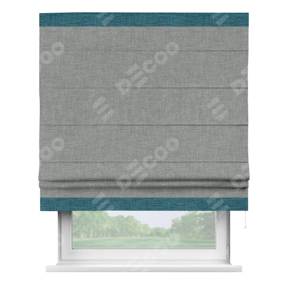 Римская штора производителя «Cortin», используется для проёма, пошита из ткани рогожка димаут тёмно-серый, артикул 80418. Отделка шторы кантом «Горизонт», ткань для канта используется из рогожки димаут разной расцветки на выбор. Имеет универсальный механизм и подходит для монтажа: на потолок, на стену и в нишу.