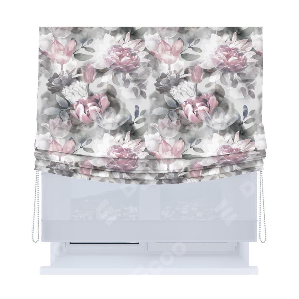 Римская штора день-ночь производителя «Cortin», используется для проёма, пошита из двух полотен, с лицевой блэкаут с нанесением сублимационной печати «Цветочная композиция», вторая ткань тюль (по стандарту комплектуется тюль белого цвета артикул V-01). Имеет универсальный механизм и подходит для монтажа: на потолок, на стену и в нишу. Удобное управление каждой шторой отдельно.