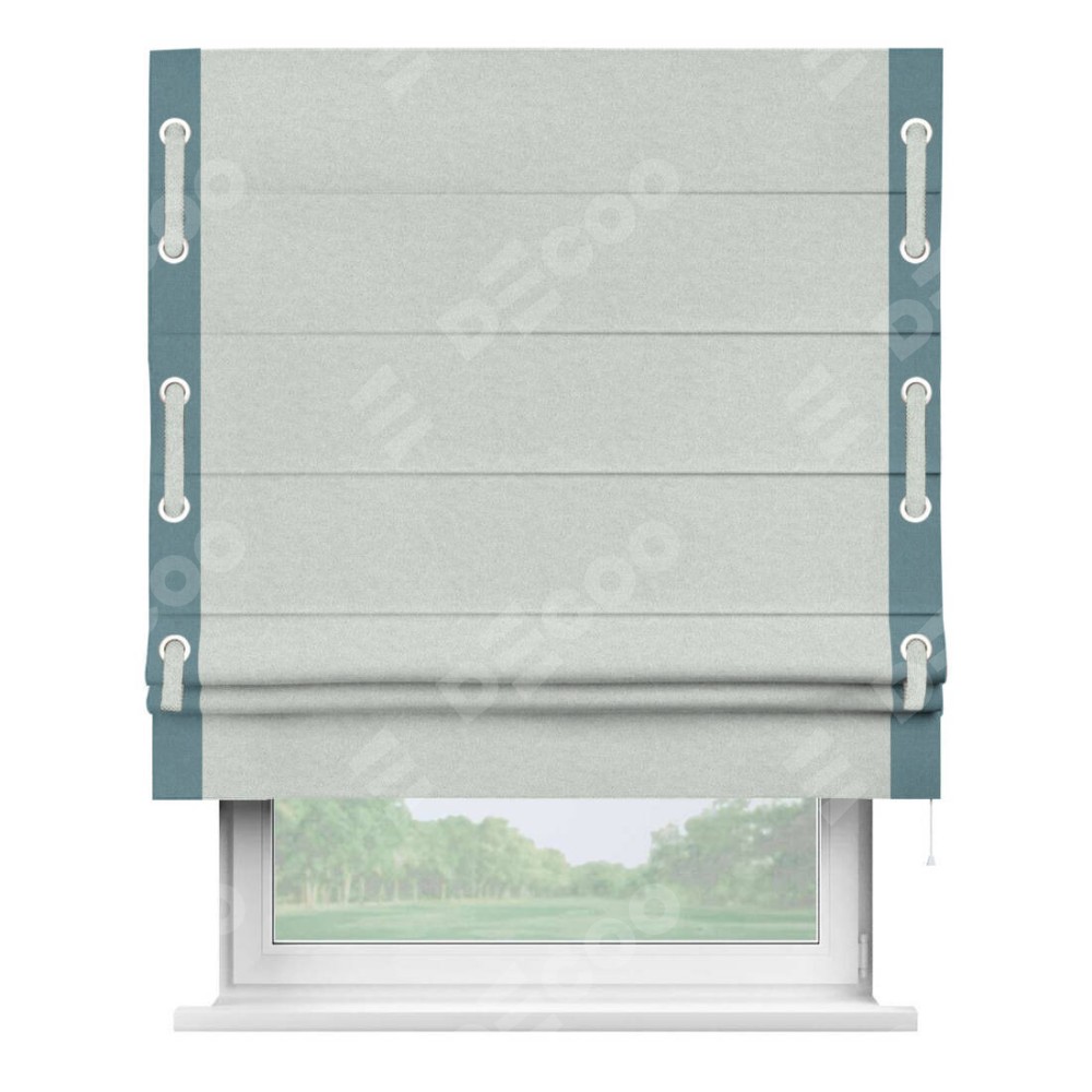 Римская штора производителя «Cortin», используется для проёма, пошита из ткани лён блэкаут белый, артикул 69451. Отделка шторы кантом «Стрим Дуо» на кантах расположены люверсы с пояском, ткань для канта используется из льна разной расцветки на выбор. Ткань для пояска обычно используется из основной ткани шторы, а так же можно сделать из любой расцветки по желанию. Имеет универсальный механизм и подходит для монтажа: на потолок, на стену и в нишу.