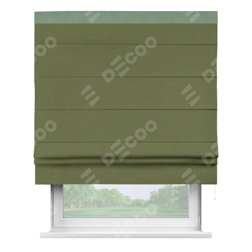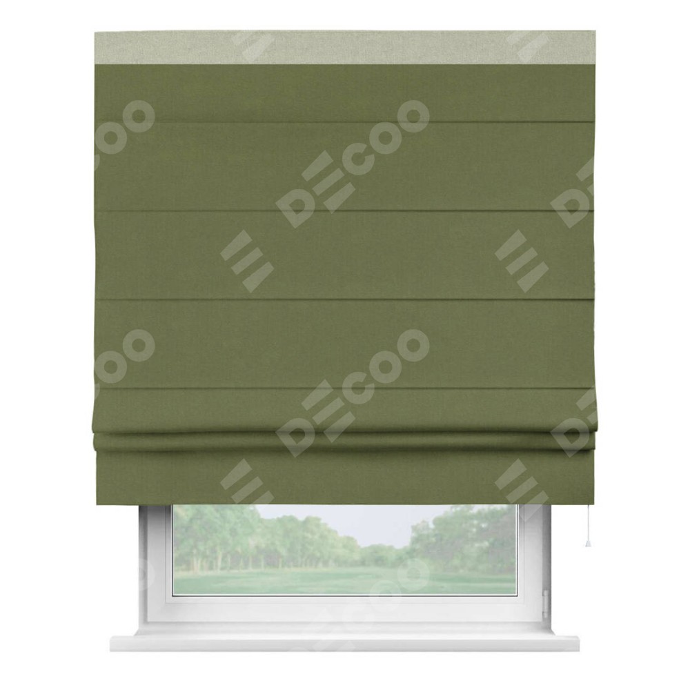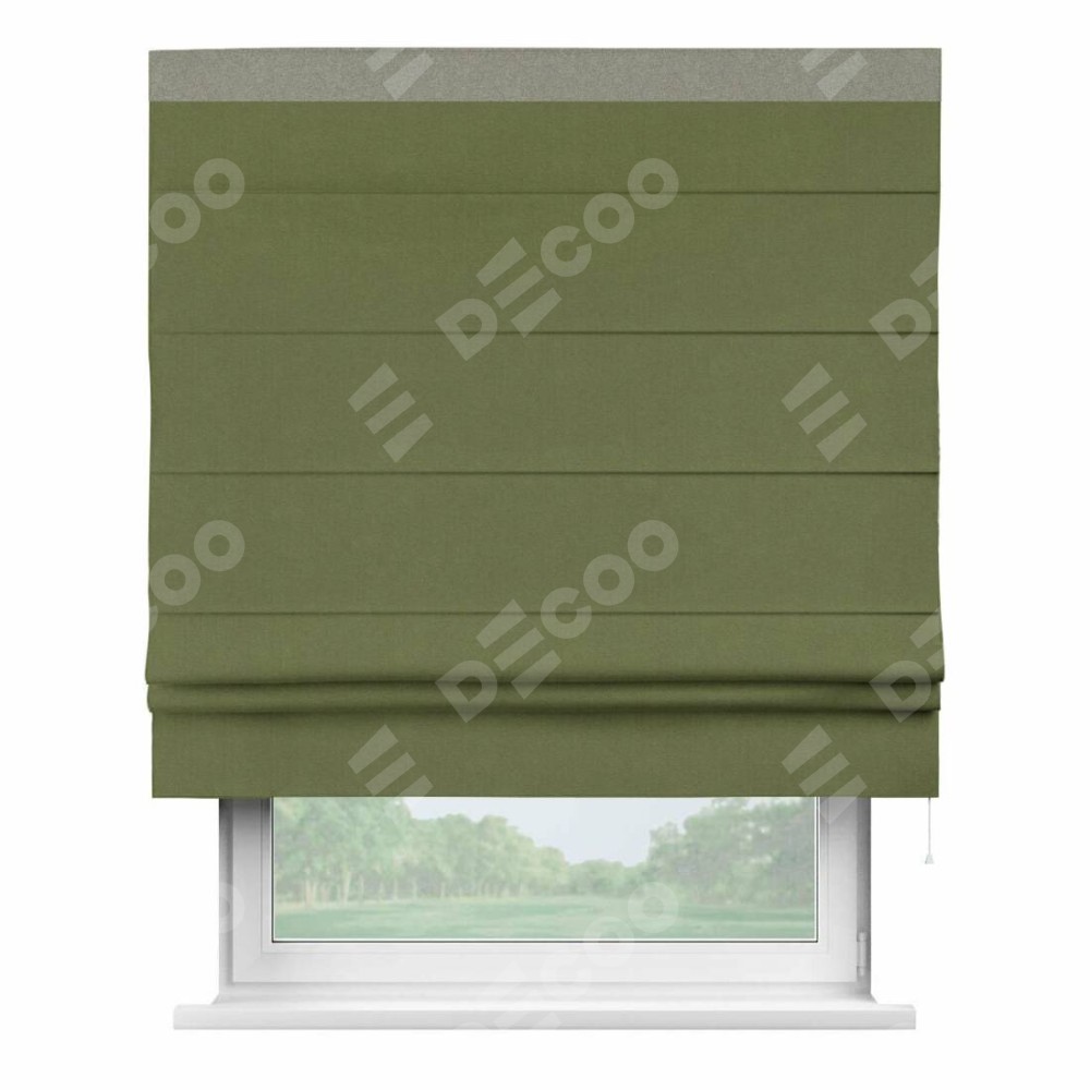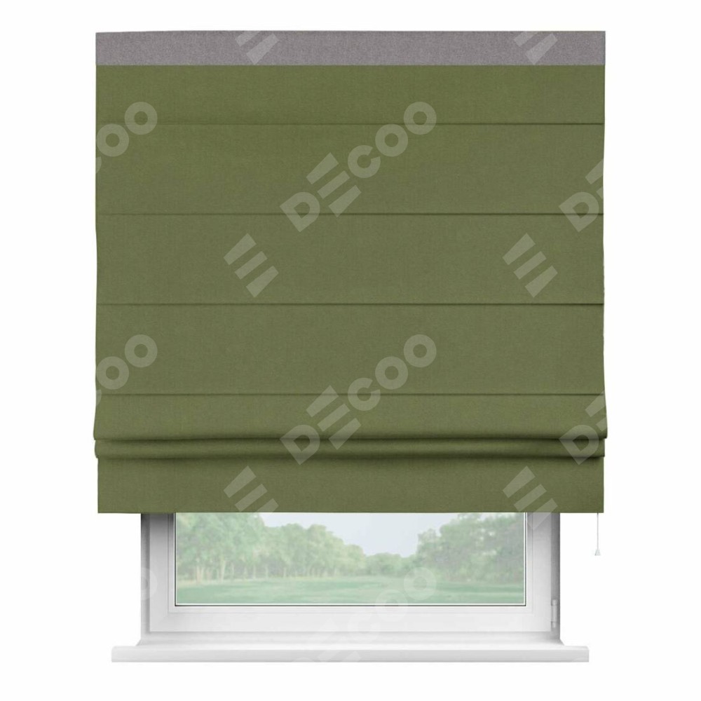 Римская штора производителя «Cortin», используется для проёма, пошита из ткани лён блэкаут оливковый, артикул 69516. Отделка шторы кантом «Кинг», ткань для канта используется из льна разной расцветки на выбор. Имеет универсальный механизм и подходит для монтажа: на потолок, на стену и в нишу.