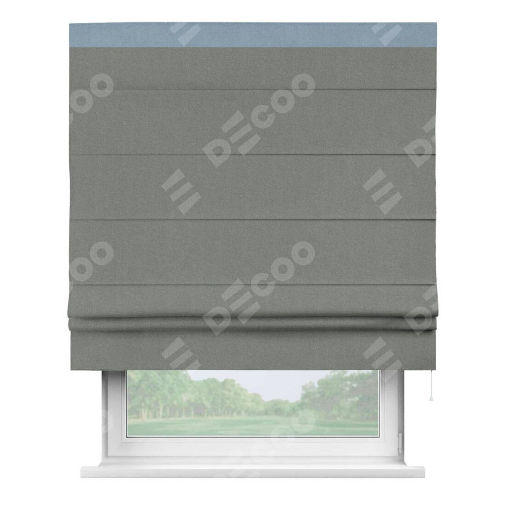 Римская штора производителя «Cortin», используется для проёма, пошита из ткани лён блэкаут серый, артикул 69447. Отделка шторы кантом «Кинг», ткань для канта используется из льна разной расцветки на выбор. Имеет универсальный механизм и подходит для монтажа: на потолок, на стену и в нишу.