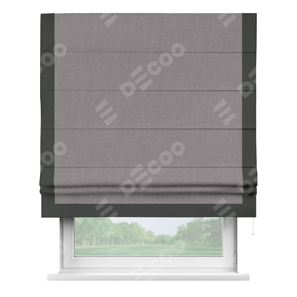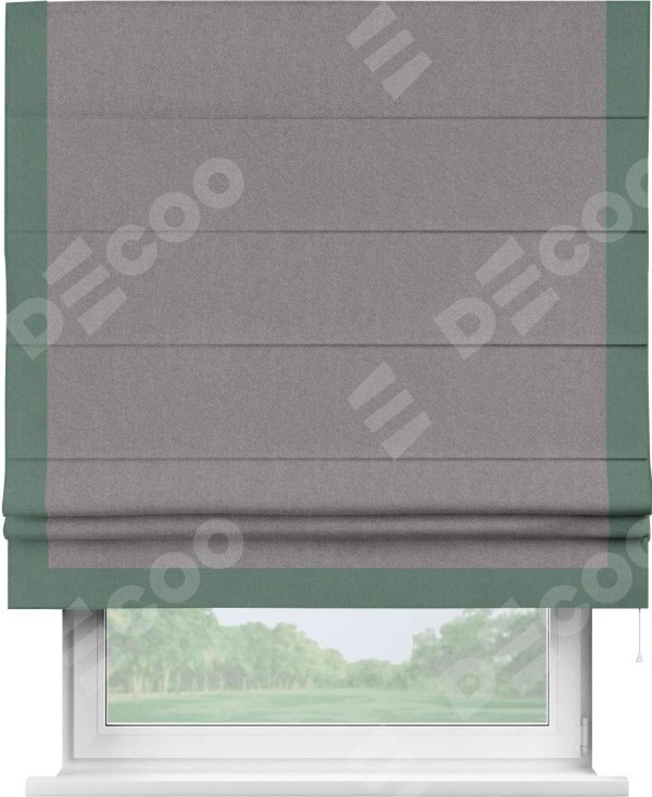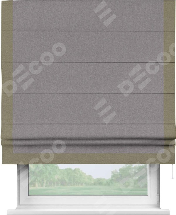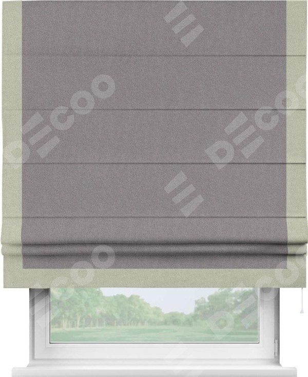 Римская штора производителя «Cortin», используется для проёма, пошита из ткани лён блэкаут сиреневый, артикул 69576. Отделка шторы кантом «Виктория», ткань для канта используется из льна разной расцветки на выбор. Имеет универсальный механизм и подходит для монтажа: на потолок, на стену и в нишу.
