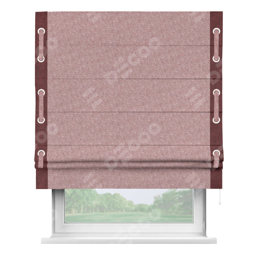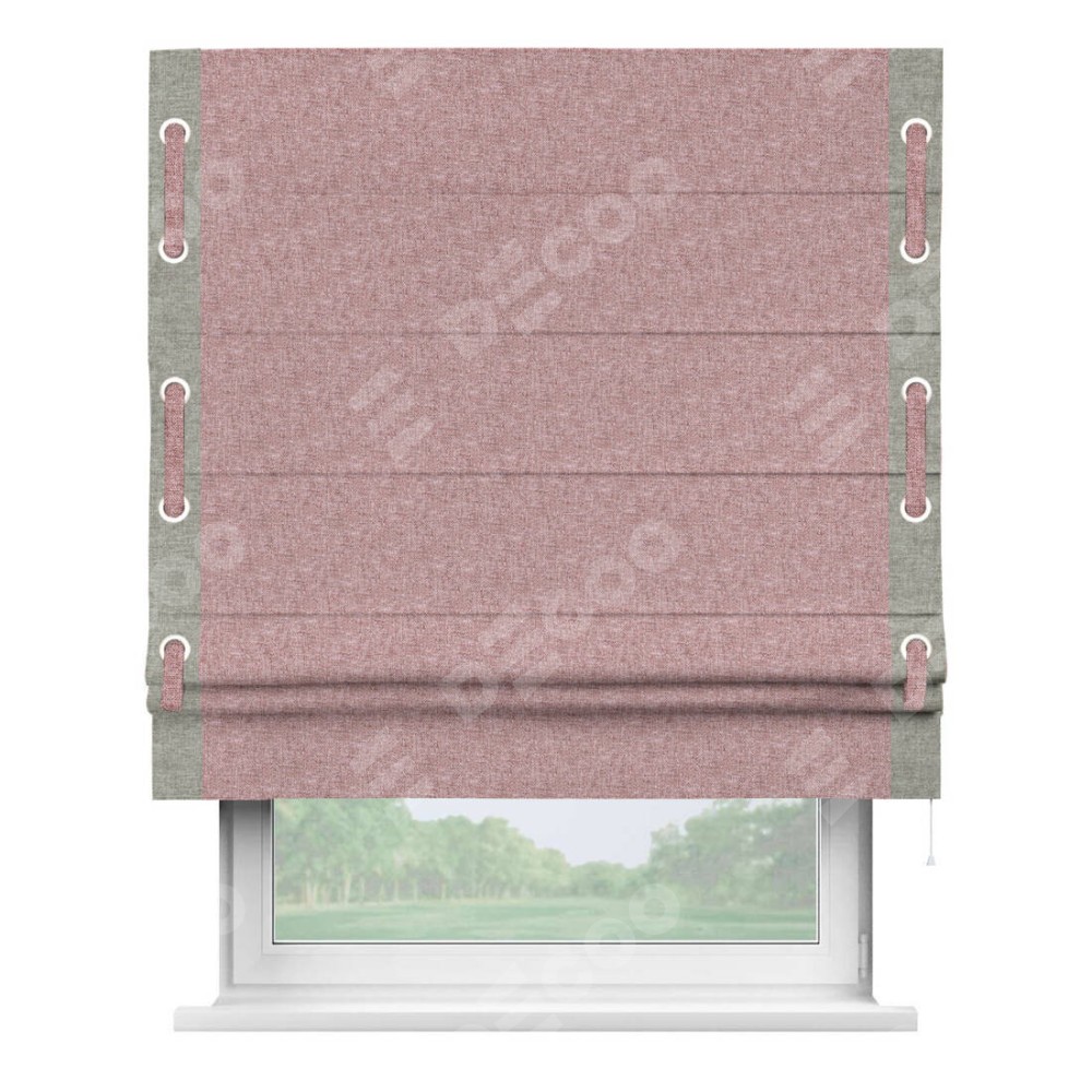 Римская штора производителя «Cortin», используется для проёма, пошита из ткани лён кашемир розовая пудра, артикул 21619. Отделка шторы кантом «Стрим Дуо» на кантах расположены люверсы с пояском, ткань для канта используется из льна разной расцветки на выбор. Ткань для пояска обычно используется из основной ткани шторы, а так же можно сделать из любой расцветки по желанию. Имеет универсальный механизм и подходит для монтажа: на потолок, на стену и в нишу.