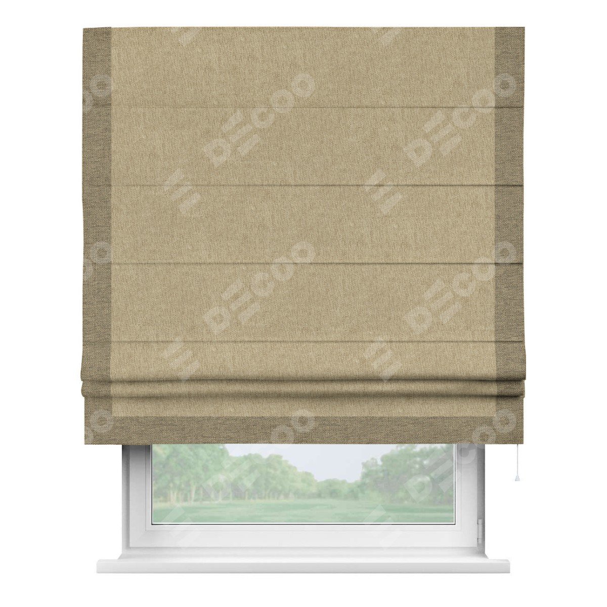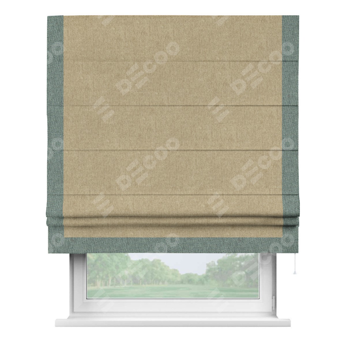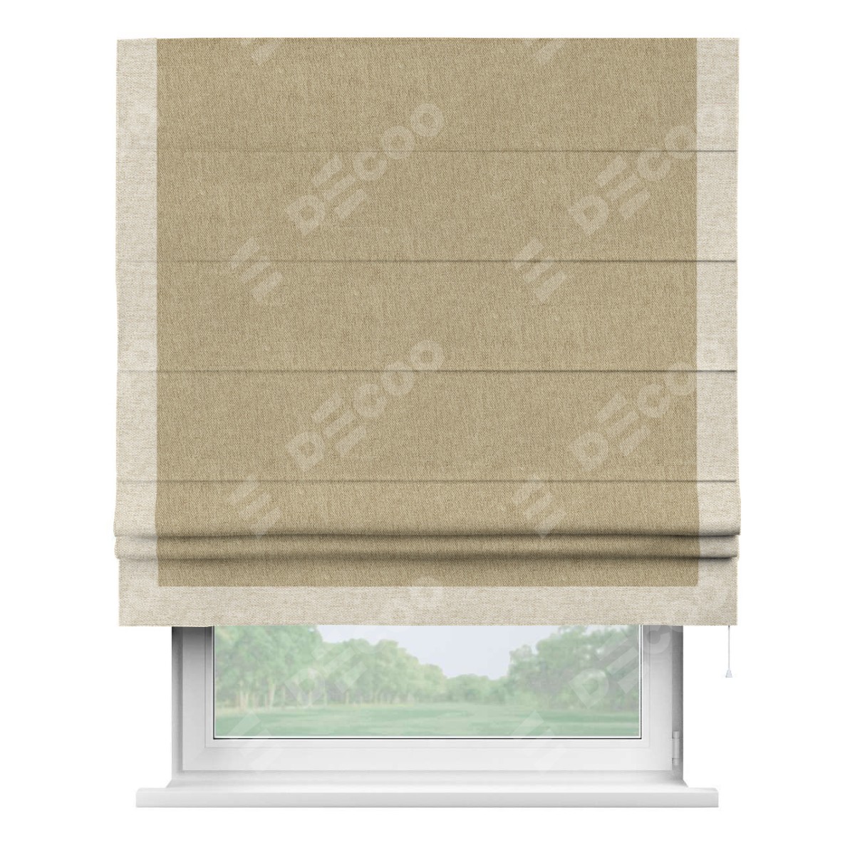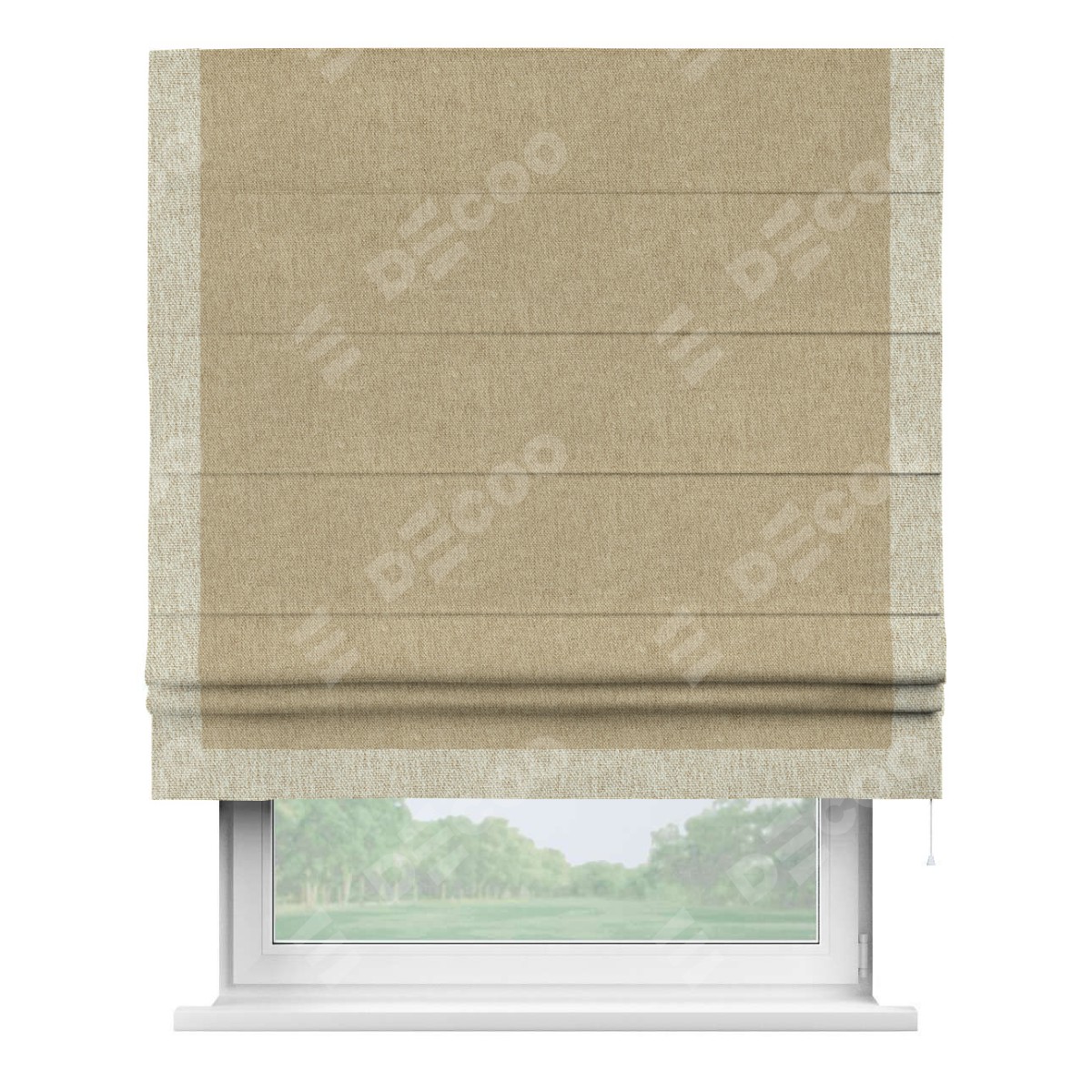 Римская штора производителя «Cortin», используется для проёма, пошита из ткани стиф димаут бежевый, артикул 18083. Отделка шторы кантом «Виктория», ткань для канта используется из стифа разной расцветки на выбор. Имеет универсальный механизм и подходит для монтажа: на потолок, на стену и в нишу.
