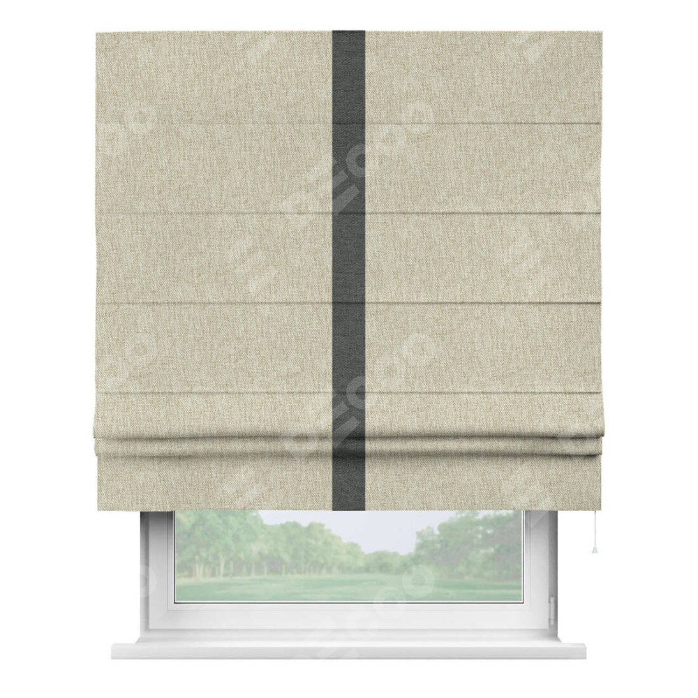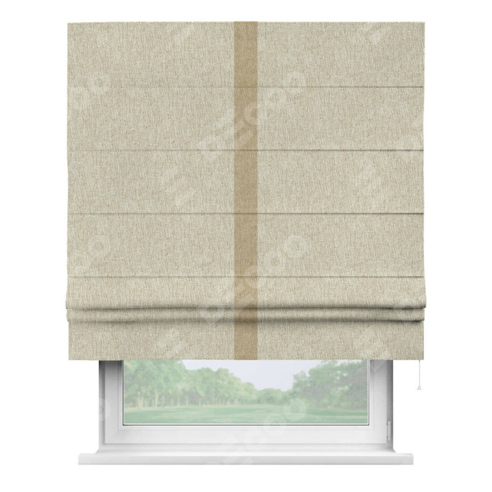 Римская штора производителя «Cortin», используется для проёма, пошита из ткани стиф димаут светло-бежевый, артикул 18084. Отделка шторы кантом «Хайвэй», ткань для канта используется из стифа разной расцветки на выбор. Имеет универсальный механизм и подходит для монтажа: на потолок, на стену и в нишу.
