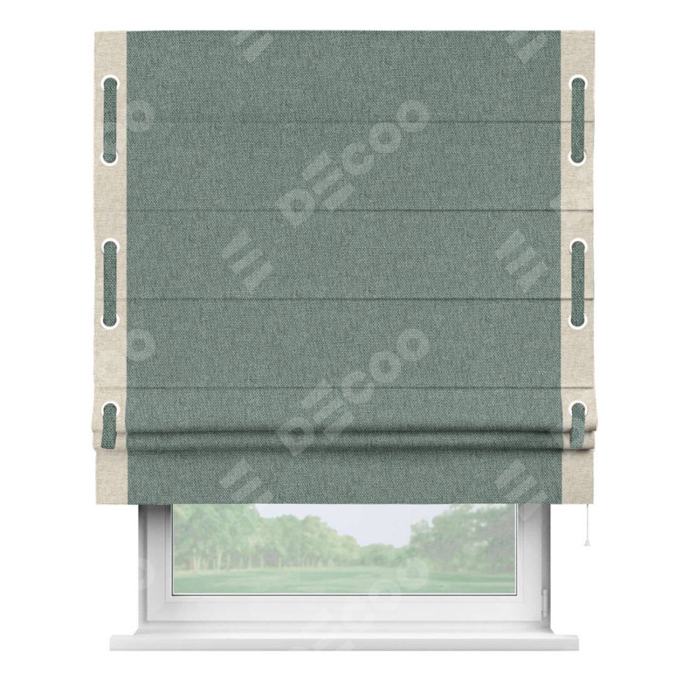 Римская штора производителя «Cortin», используется для проёма, пошита из ткани стиф димаут серо-голубой, артикул 44029. Отделка шторы кантом «Стрим Дуо» на кантах расположены люверсы с пояском, ткань для канта используется из стифа разной расцветки на выбор. Ткань для пояска обычно используется из основной ткани шторы, а так же можно сделать из любой расцветки по желанию. Имеет универсальный механизм и подходит для монтажа: на потолок, на стену и в нишу.