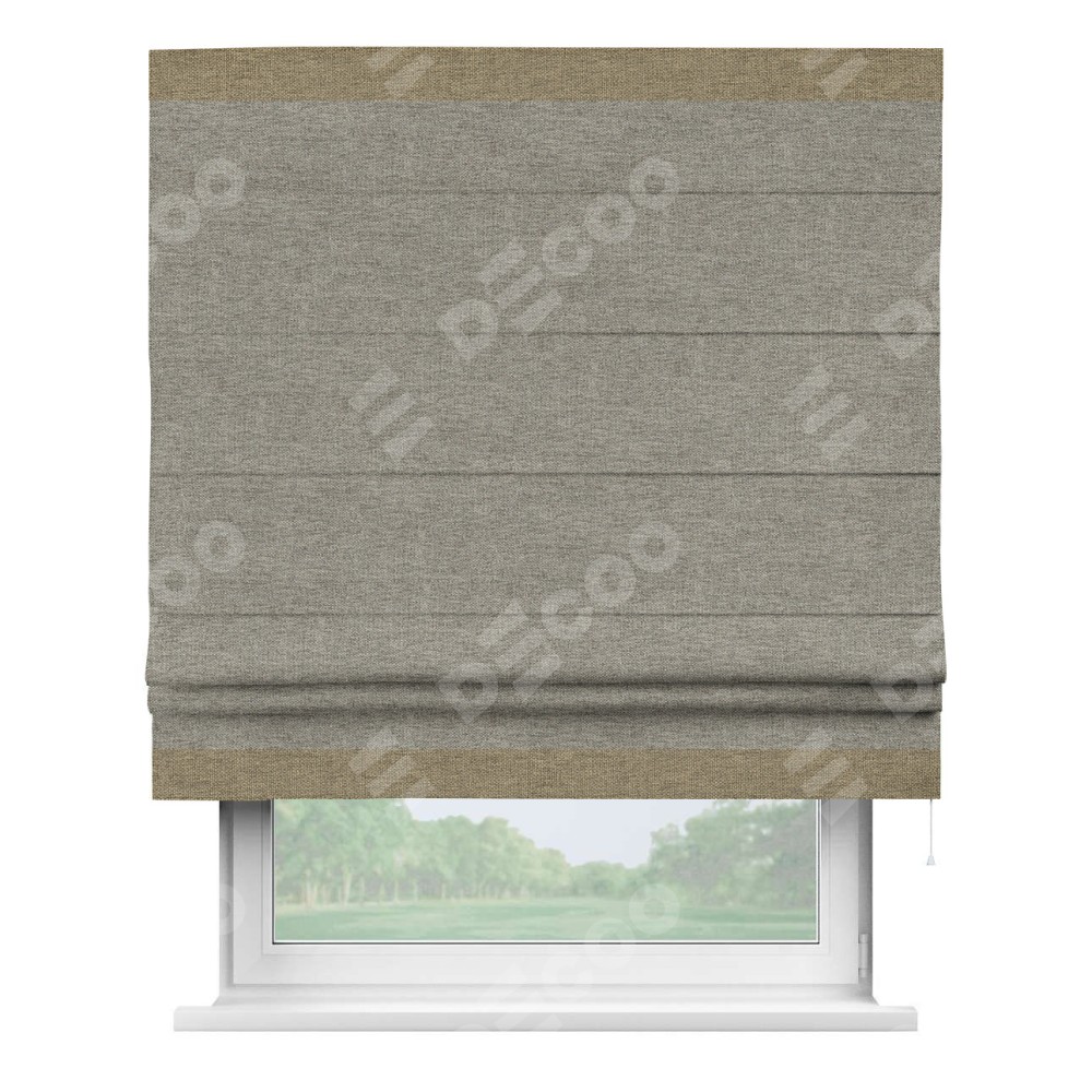 Римская штора производителя «Cortin», используется для проёма, пошита из ткани стиф димаут серо-коричневый, артикул 44028. Отделка шторы кантом «Горизонт», ткань для канта используется из стифа разной расцветки на выбор. Имеет универсальный механизм и подходит для монтажа: на потолок, на стену и в нишу.