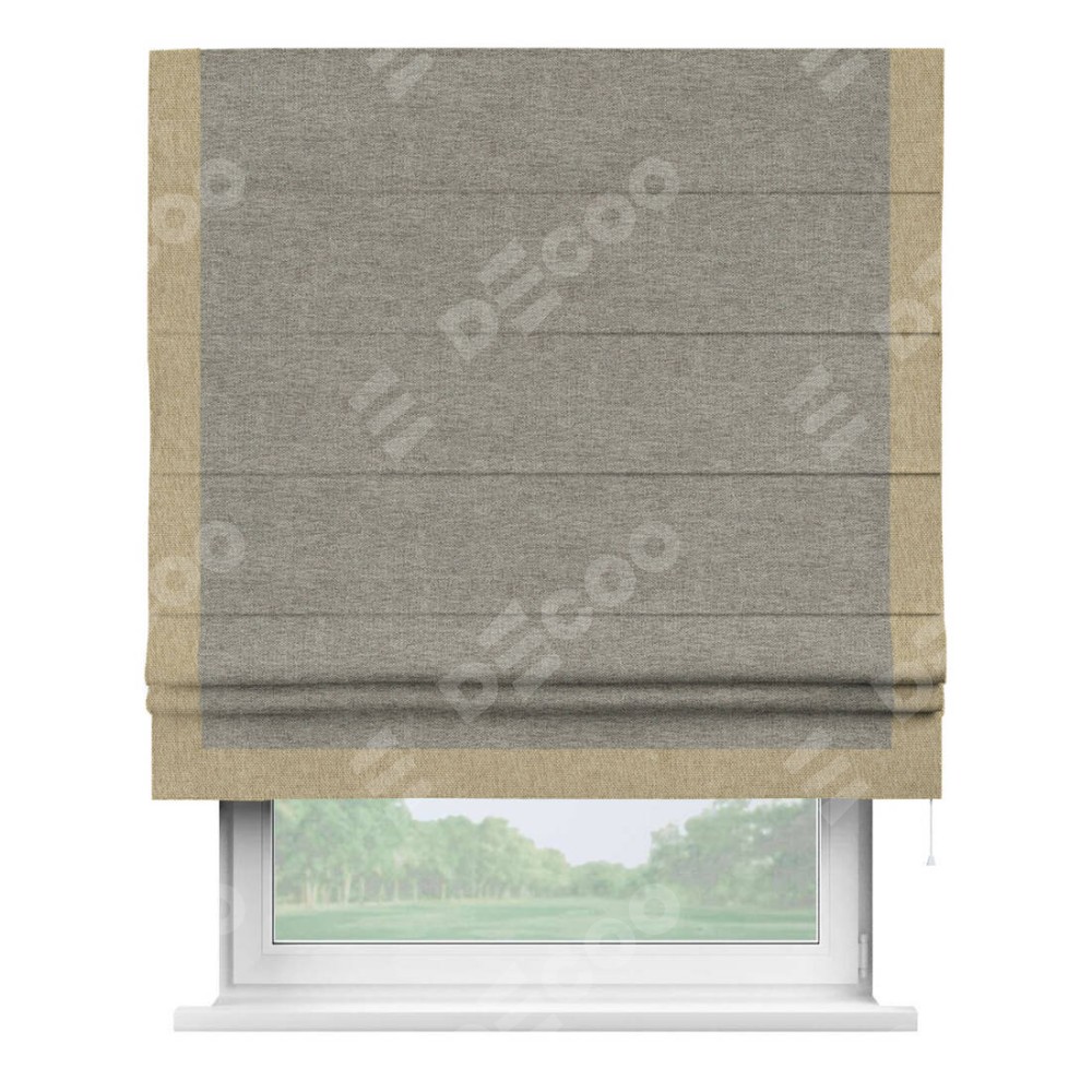 Римская штора производителя «Cortin», используется для проёма, пошита из ткани стиф димаут серо-коричневый, артикул 44028. Отделка шторы кантом «Виктория», ткань для канта используется из стифа разной расцветки на выбор. Имеет универсальный механизм и подходит для монтажа: на потолок, на стену и в нишу.
