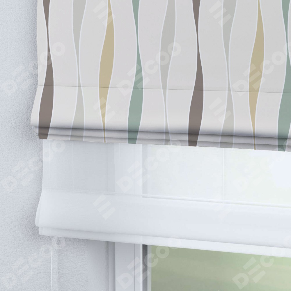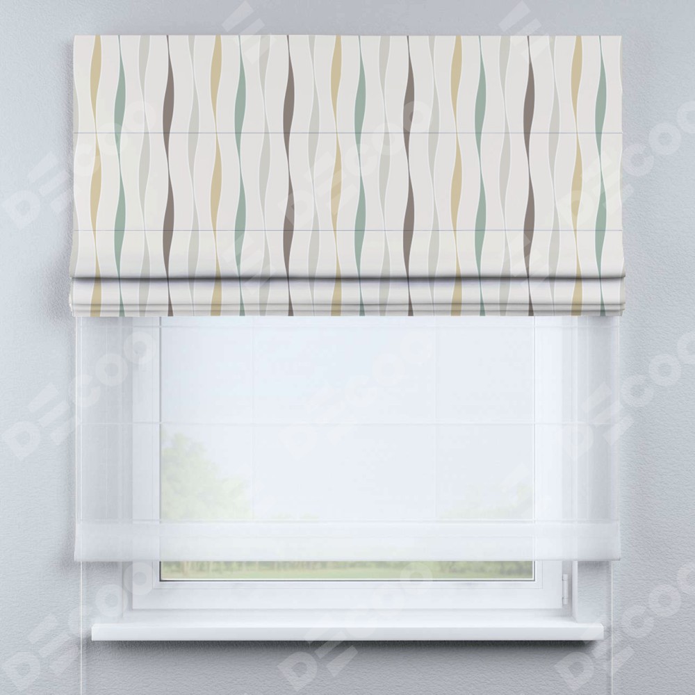 Римская штора день-ночь производителя «Cortin», используется для проёма, пошита из двух полотен, с лицевой блэкаут с нанесением сублимационной печати «Дельта», вторая ткань тюль (по стандарту комплектуется тюль белого цвета артикул V-01). Имеет универсальный механизм и подходит для монтажа: на потолок, на стену и в нишу.