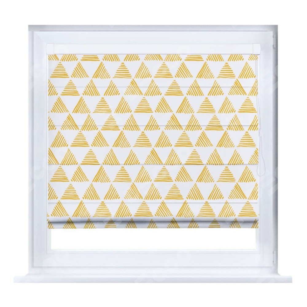 Римская штора производителя «Cortin», устанавливается на створку окна, пошита из ткани блэкаут с нанесением сублимационной печати «Желтые треугольники». Штора шьётся по индивидуальным размерам, для данного типа римской шторы возможная ширина от 35 до 150 см., высота до 250 см.