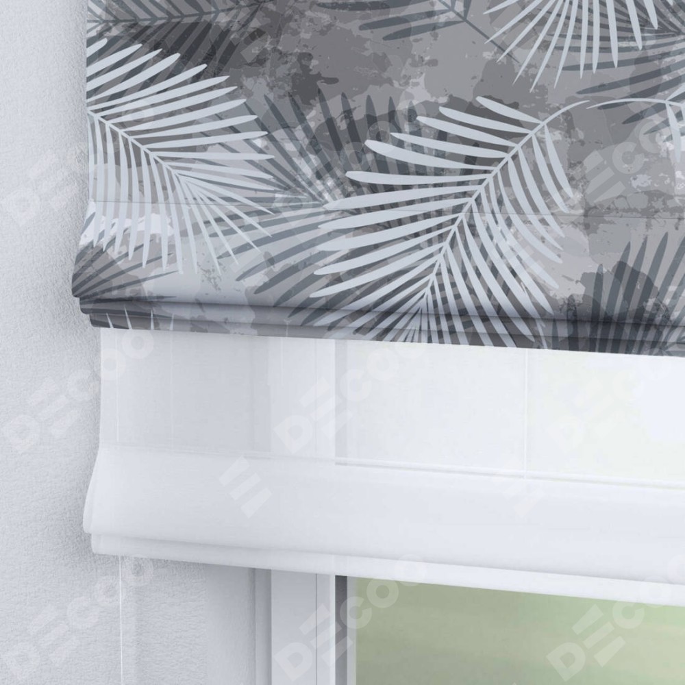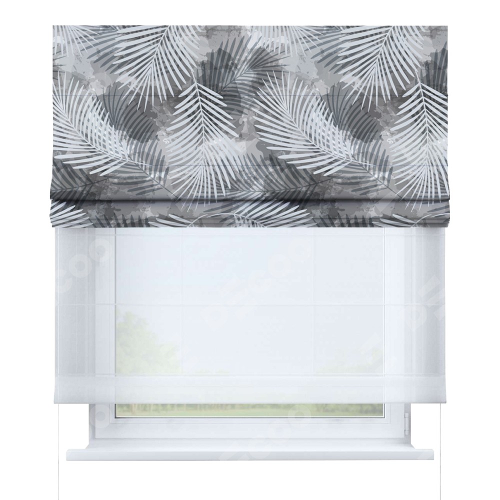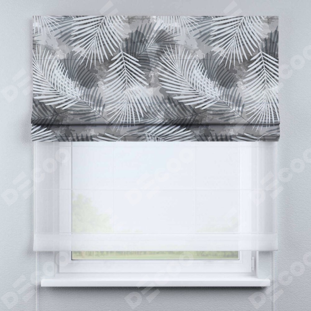 Римская штора день-ночь производителя «Cortin», используется для проёма, пошита из двух полотен, с лицевой блэкаут с нанесением сублимационной печати «Листья в тени», вторая ткань тюль (по стандарту комплектуется тюль белого цвета артикул V-01). Имеет универсальный механизм и подходит для монтажа: на потолок, на стену и в нишу.